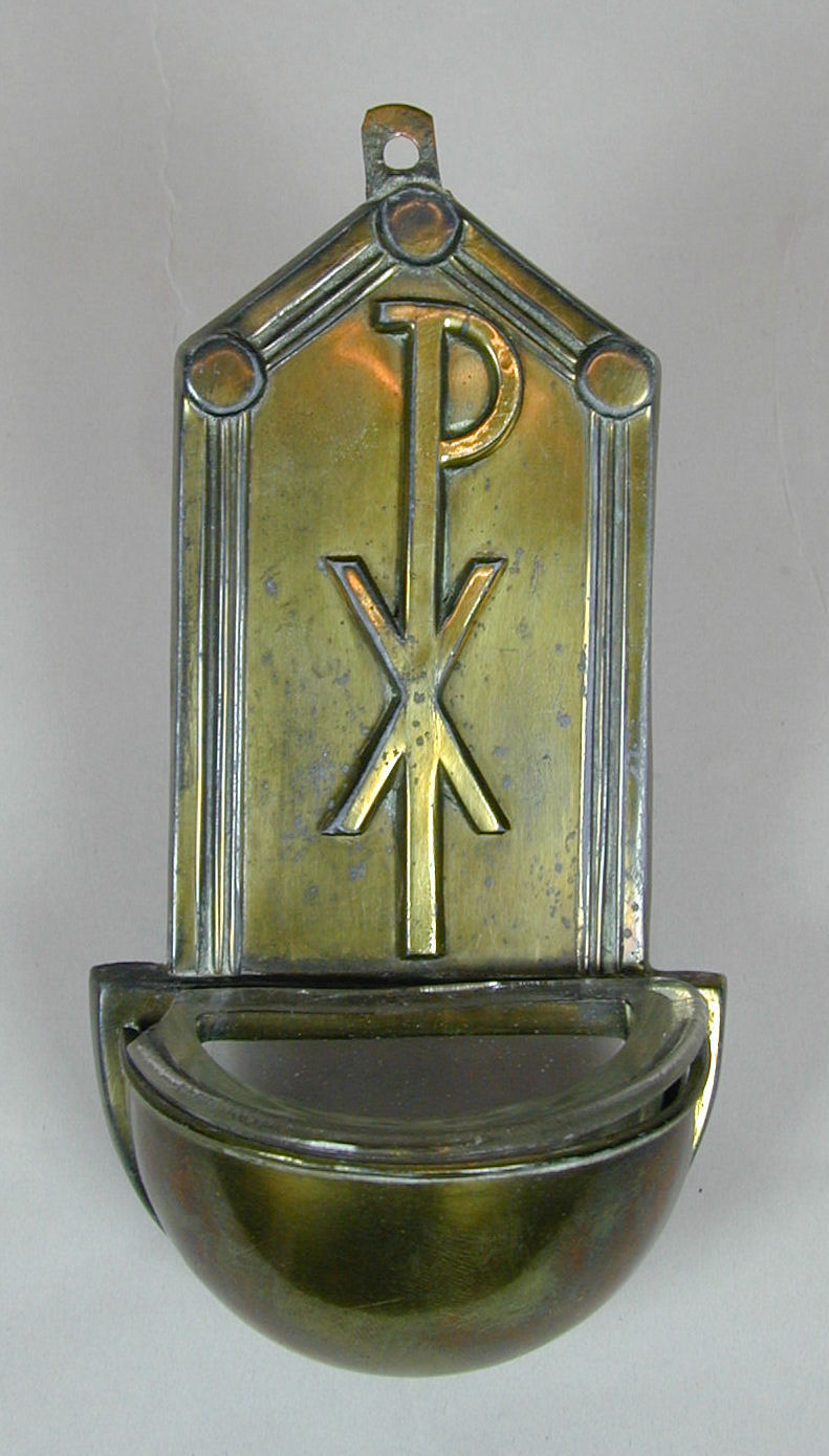Wijwaterbakje, rechthoekig achterbord met driehoekige punt, met glazen bakje