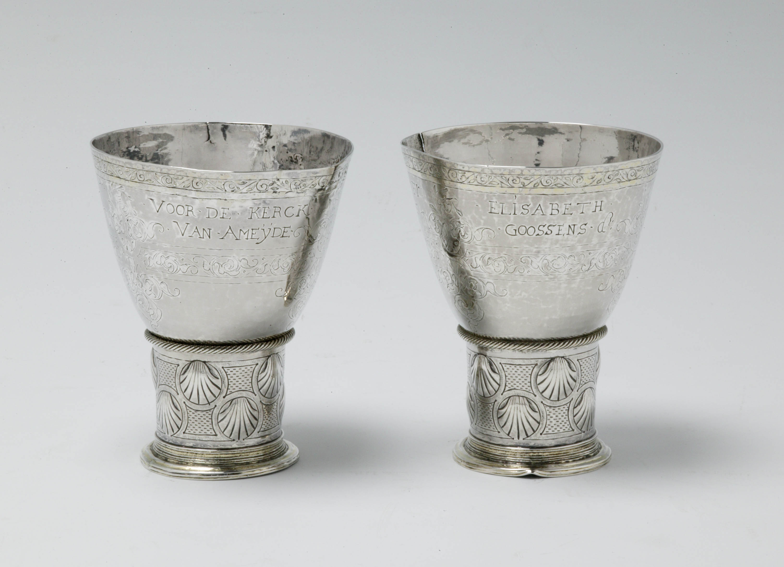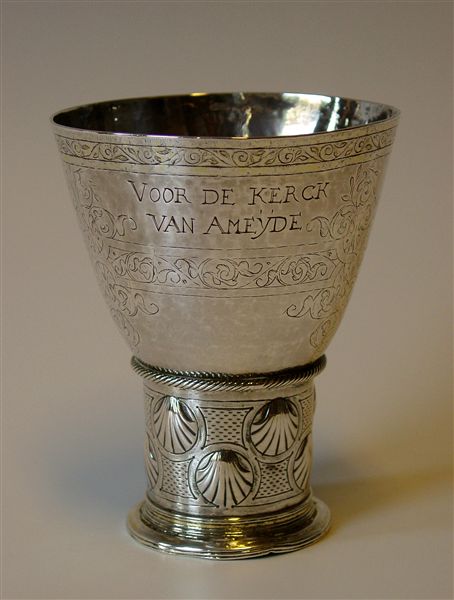 Zilveren avondmaalsbeker met "Voor de kerck van Ameijde" (Ameide), "Edzardus Fr Auricanus" en "Elisabeth Goossens d"