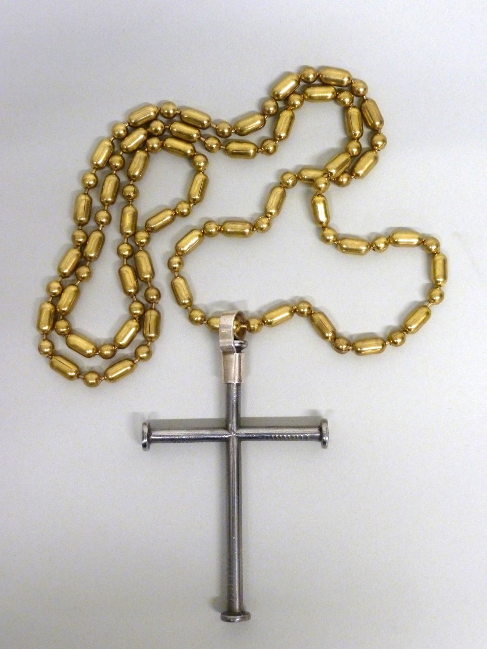 God is a DJ: Goudkleurige halsketting waaraan kruis gemaakt uit kopspijkers