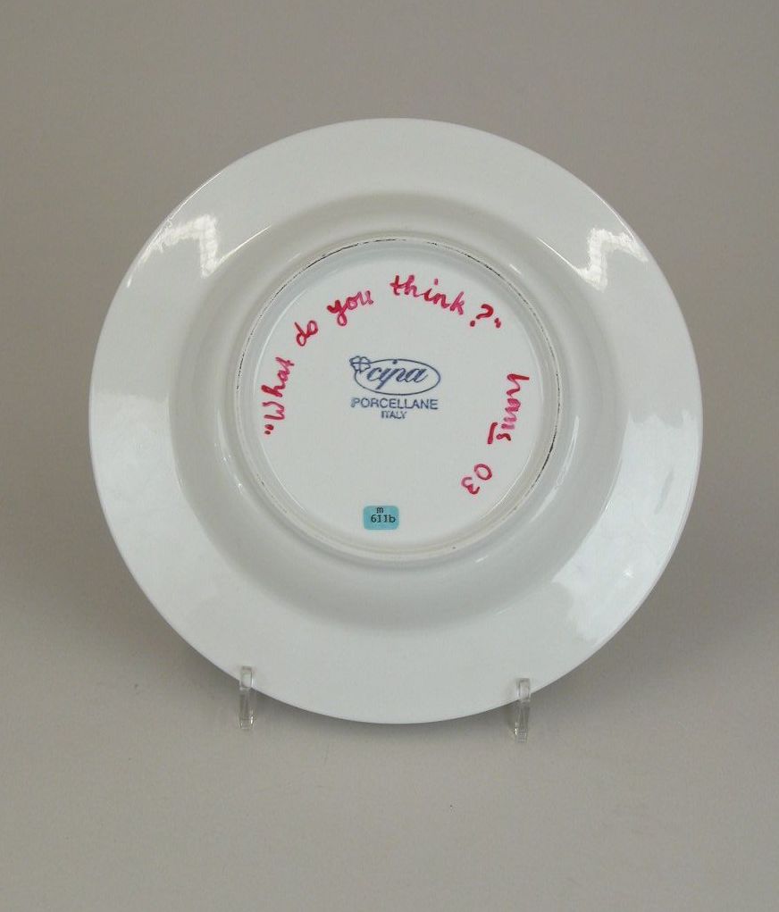 Wit diep bord met achterop "What do you think?", bij RMCC m611a