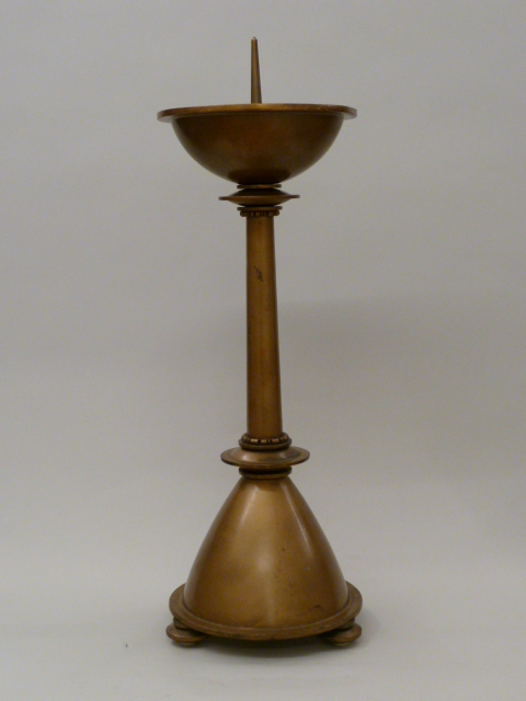 Altaarkandelaar op ronde voet waarbij de stam onder en boven wordt afgesloten door een bolle schijf