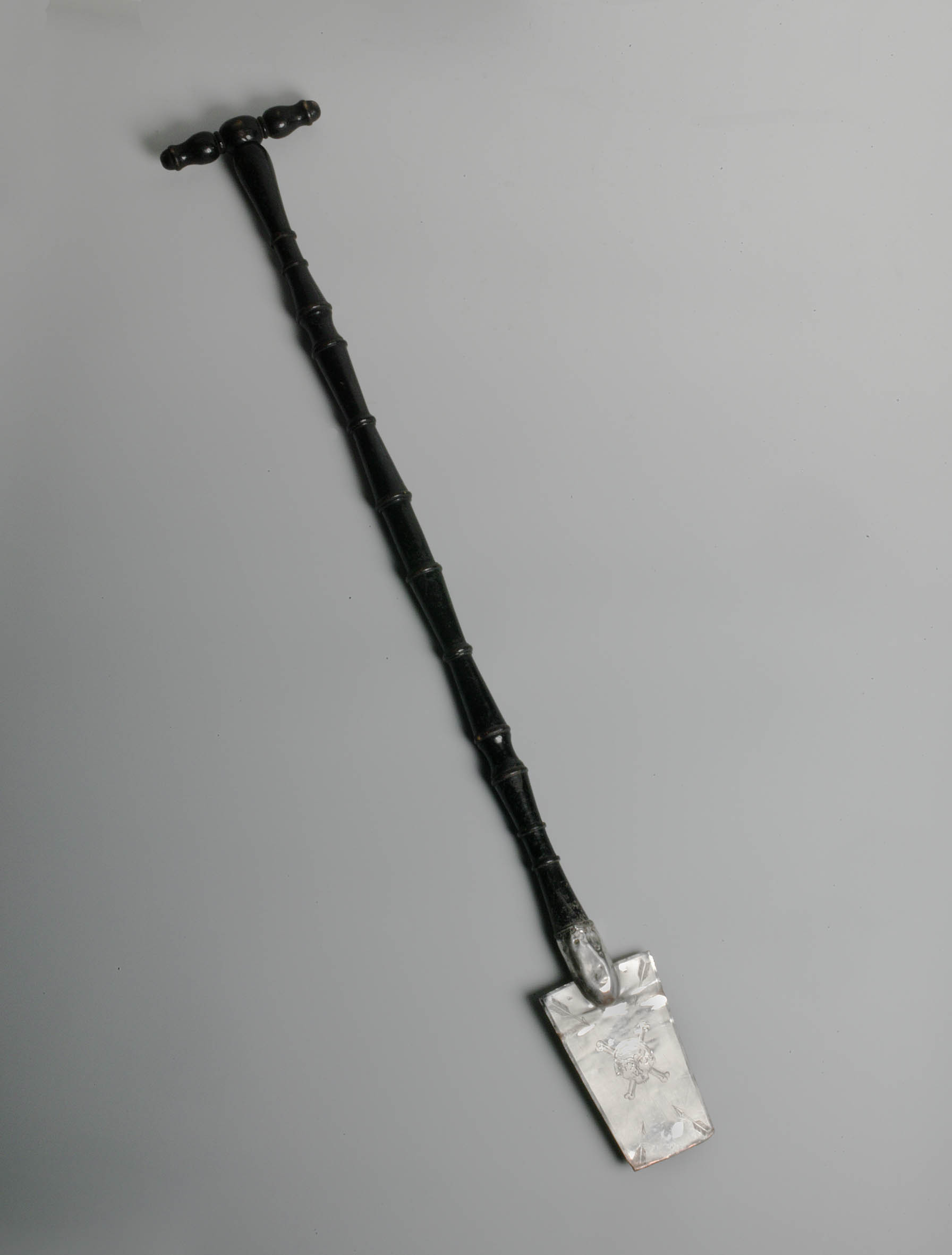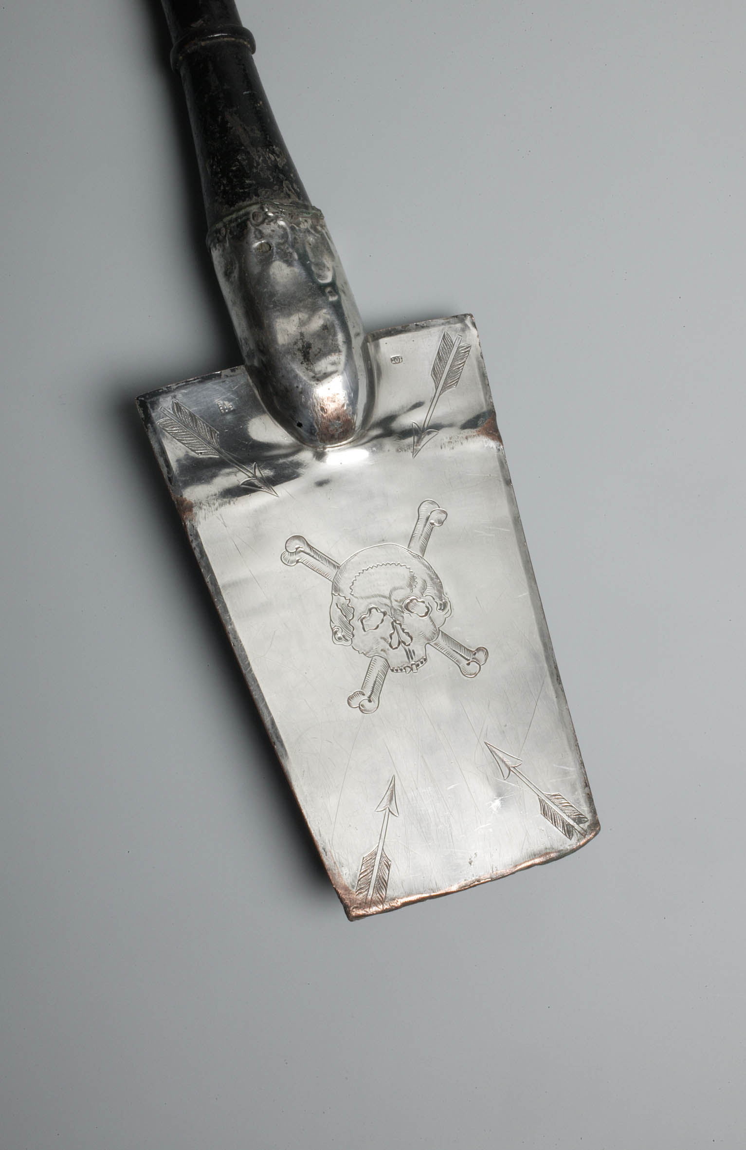 Beaardingsschep van verzilverd koper met ingegraveerd doodshoofd en vier pijlen, aan houten steel