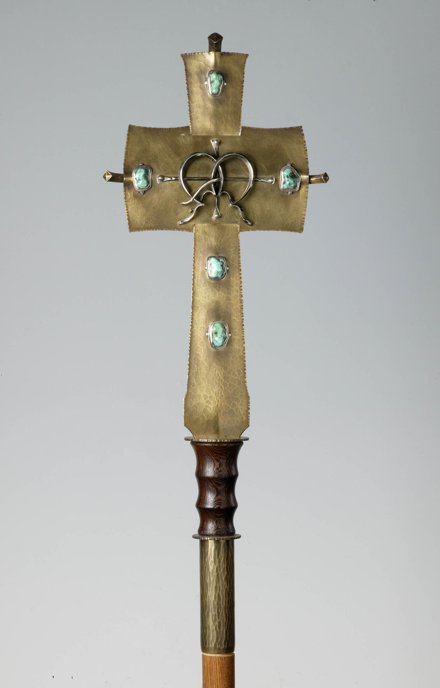 Geelkoperen processiekruis met een in zilver opgelegd kruis waarop Alfa en Omega waaromheen vijf halfedelstenen