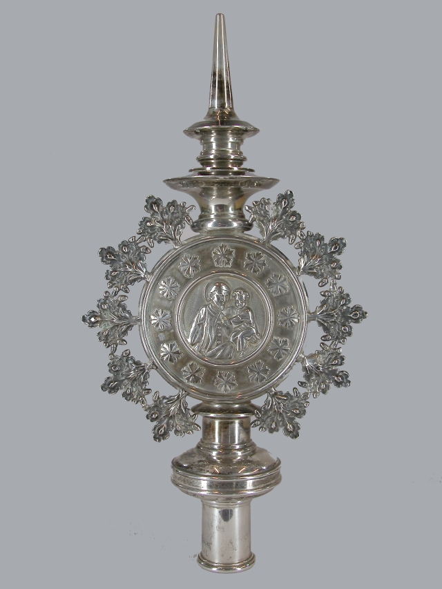Stafbekroning met medaillion met St. Vincentius a Paolo waarachter holle ruimte met deksel omgeven door eikenloof