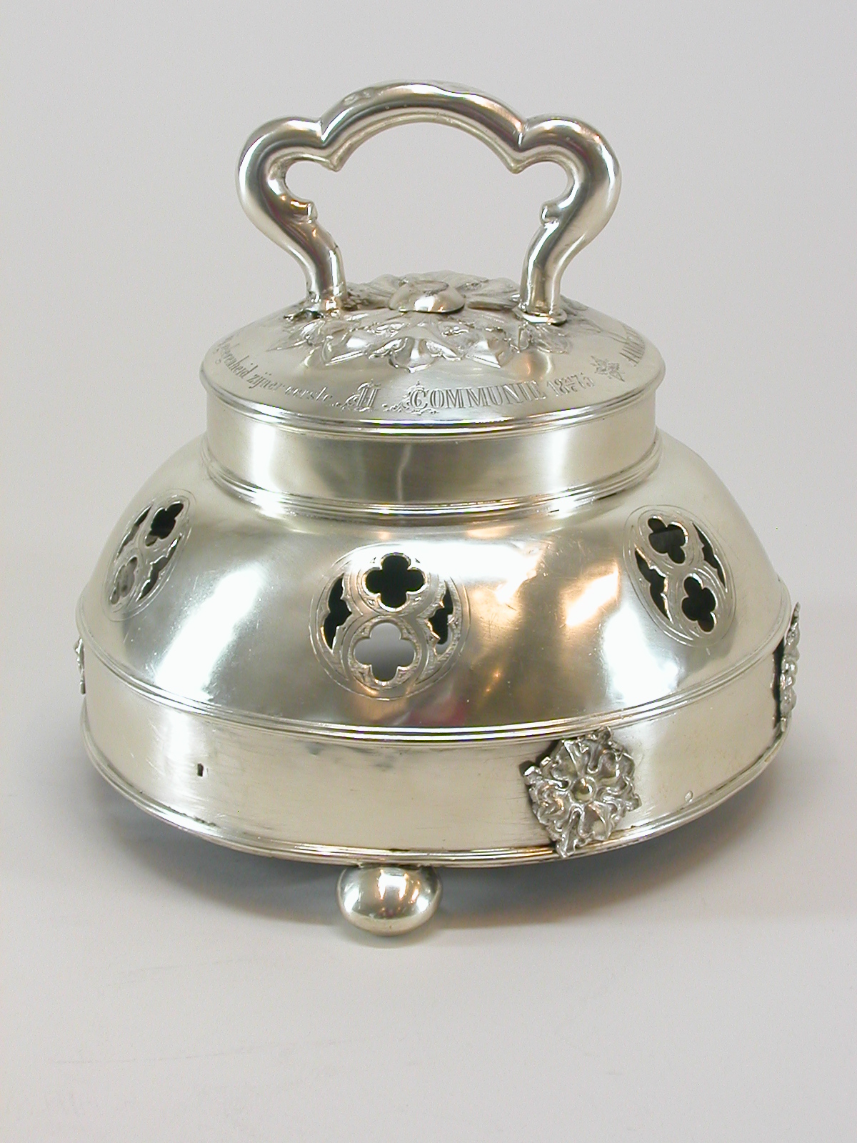 Altaarbel op drie bolpootjes een mantel met aan de onderzijde een band, versierd met rozetten. Het handvat is op een rozet gesoldeerd. Aan de bovenzijde de inscriptie: "aandenken aan Jozef van Gulick van 's-Hertogenbosch bij gelegenheid zijner eerste communie 18 21/6 75".