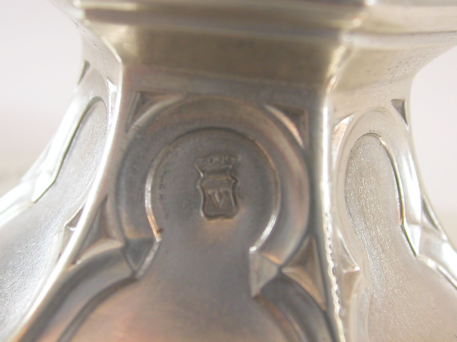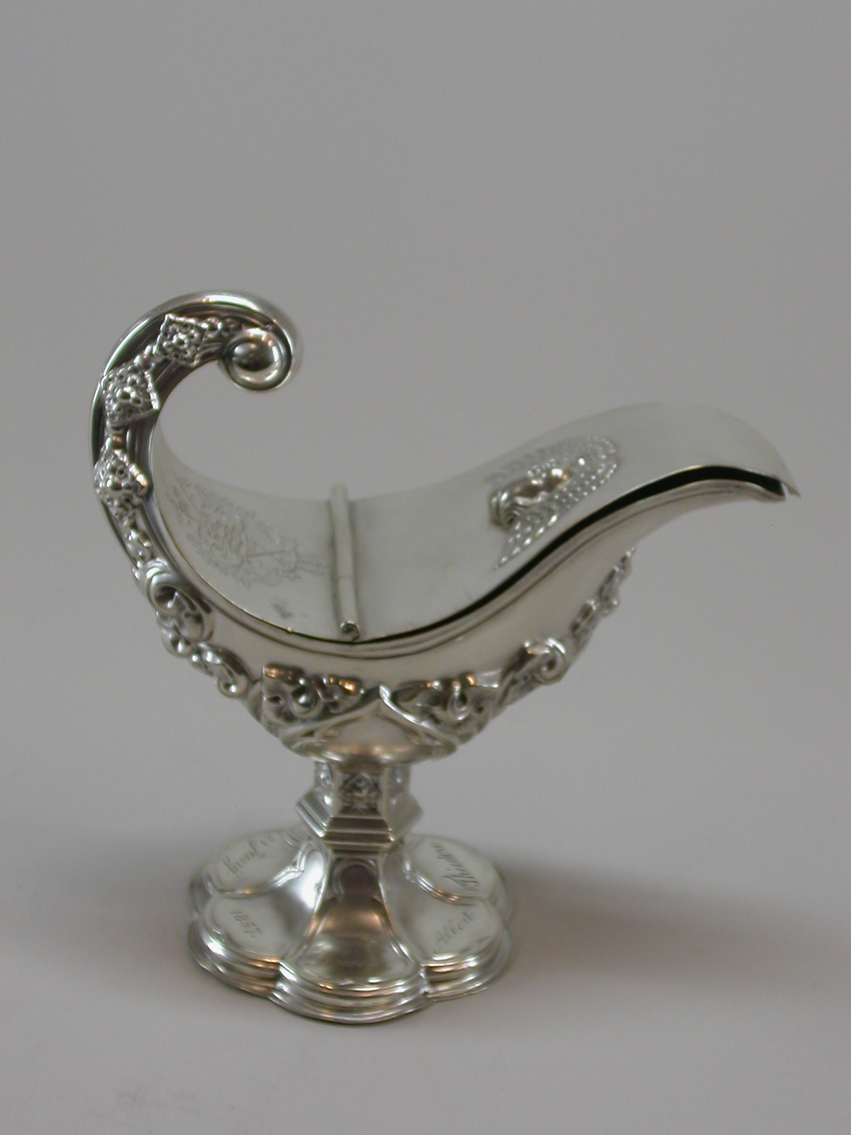Wierookscheepje op zeslobbige gewelfde voet met in de lobben de inscriptie "Louis Albert Théodore von Motz 21 Junij 1857", met op deksel gedreven engelkopje en familiewapen van de familie Von Motz