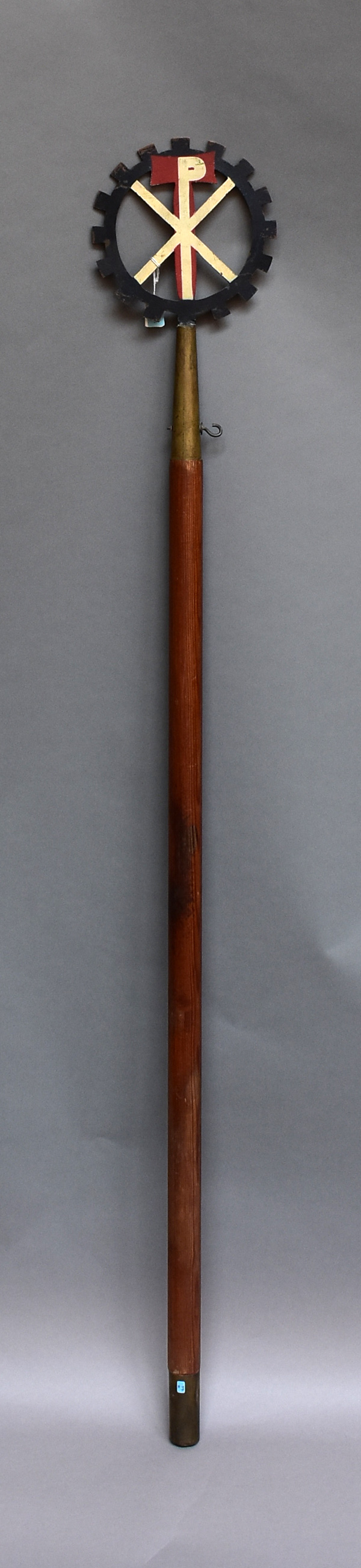 Vaandelstok met als bekroning een tandrad waarin Christusmonogram