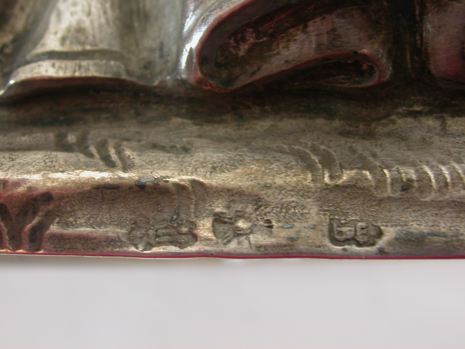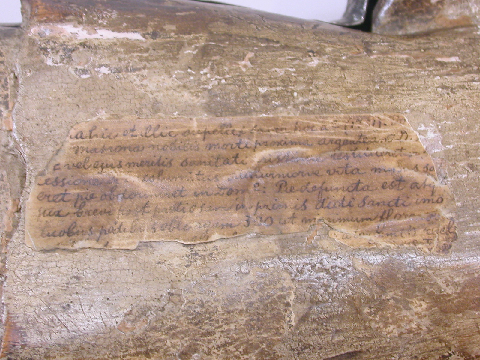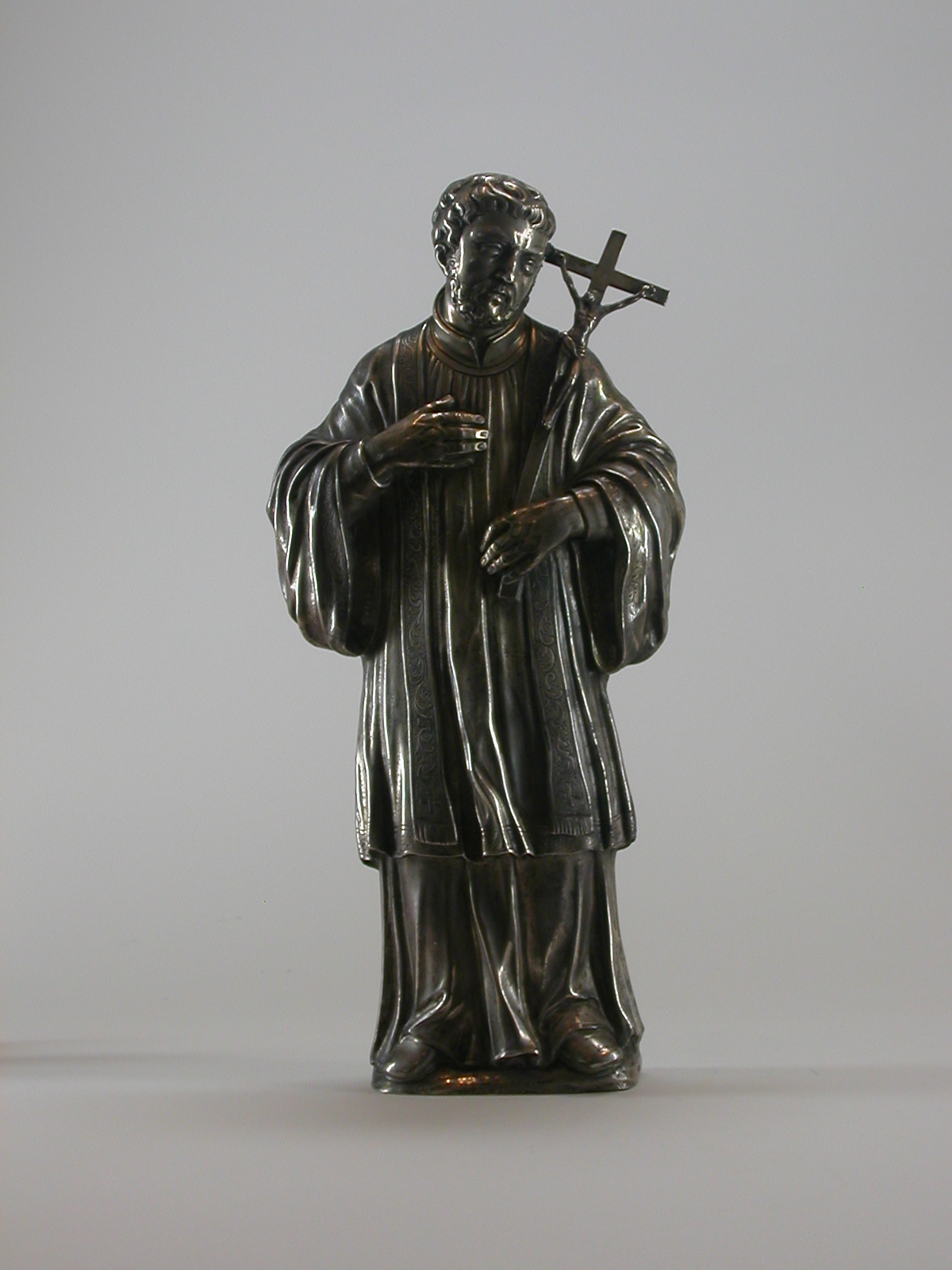 H. Franciscus Xaverius staande op een grondje en gekleed in een superplie met stola. In de linkerhand een kruisbeeld, zijn rechter houdt hij op de borst. op de onbedekte achterzijde een stuk perkament (?) met een (deels onleesbare) tekst.
