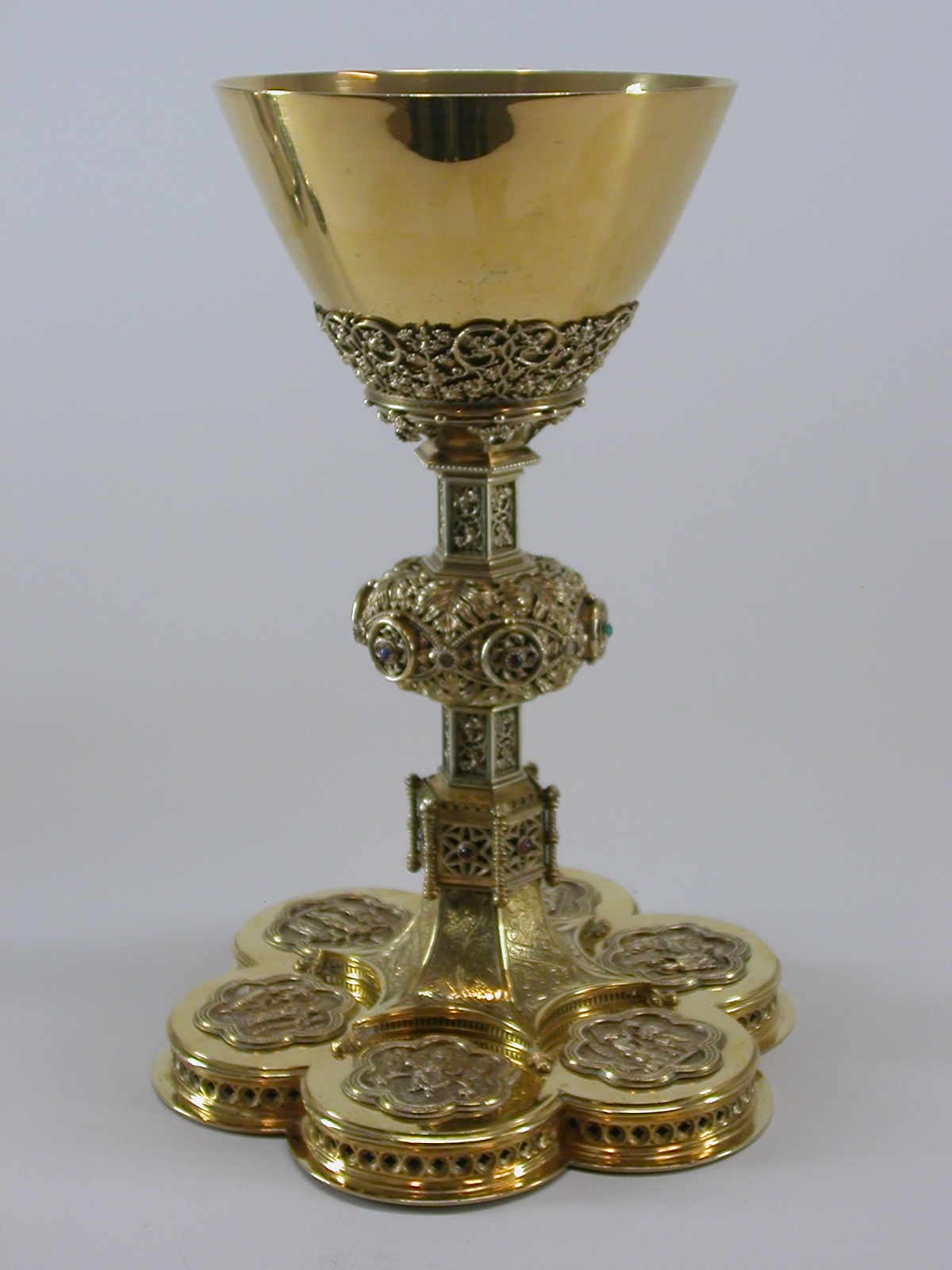 Kelk op zeslobbige voet waarop zeslobbige medaillons met reliëfvoorstellingen van o.a. de annunciatie en de aanbidding der wijzen