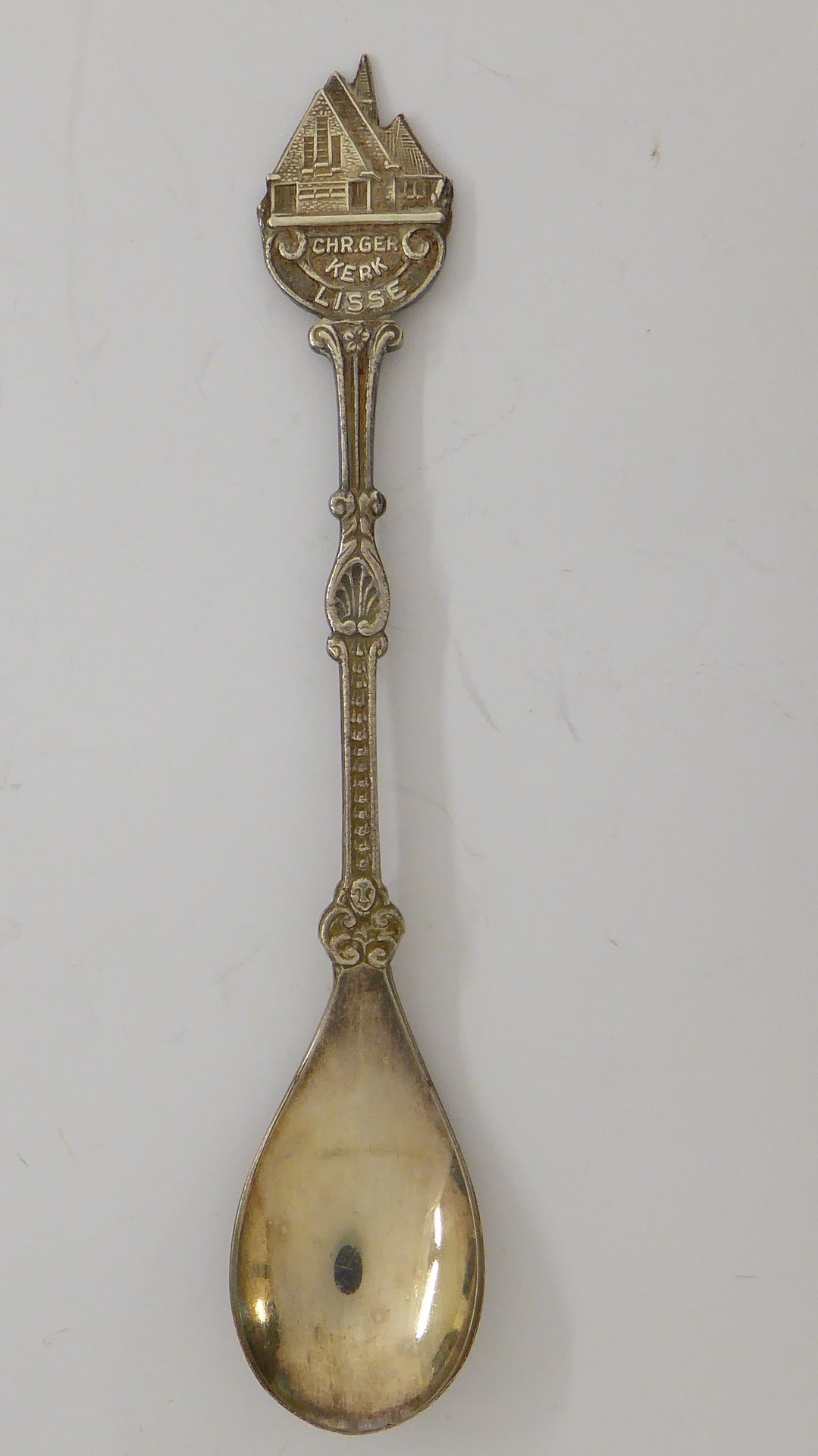 Theelepeltje met kerkgebouw, met "Chr. Ger. Kerk Lisse"