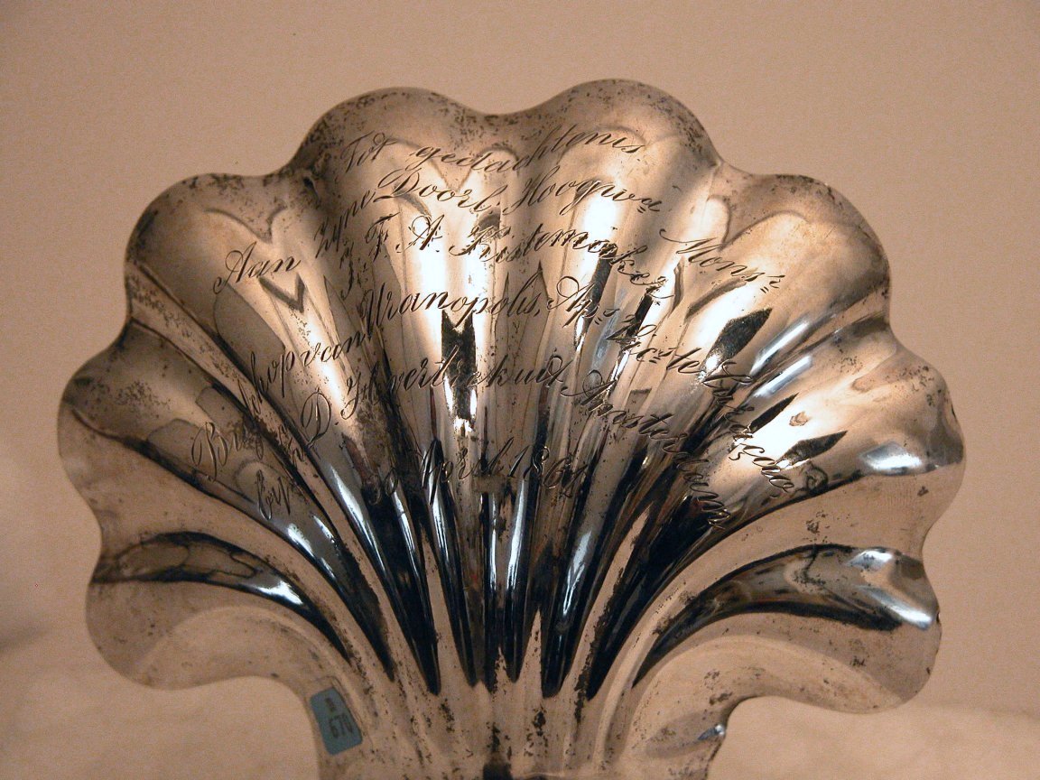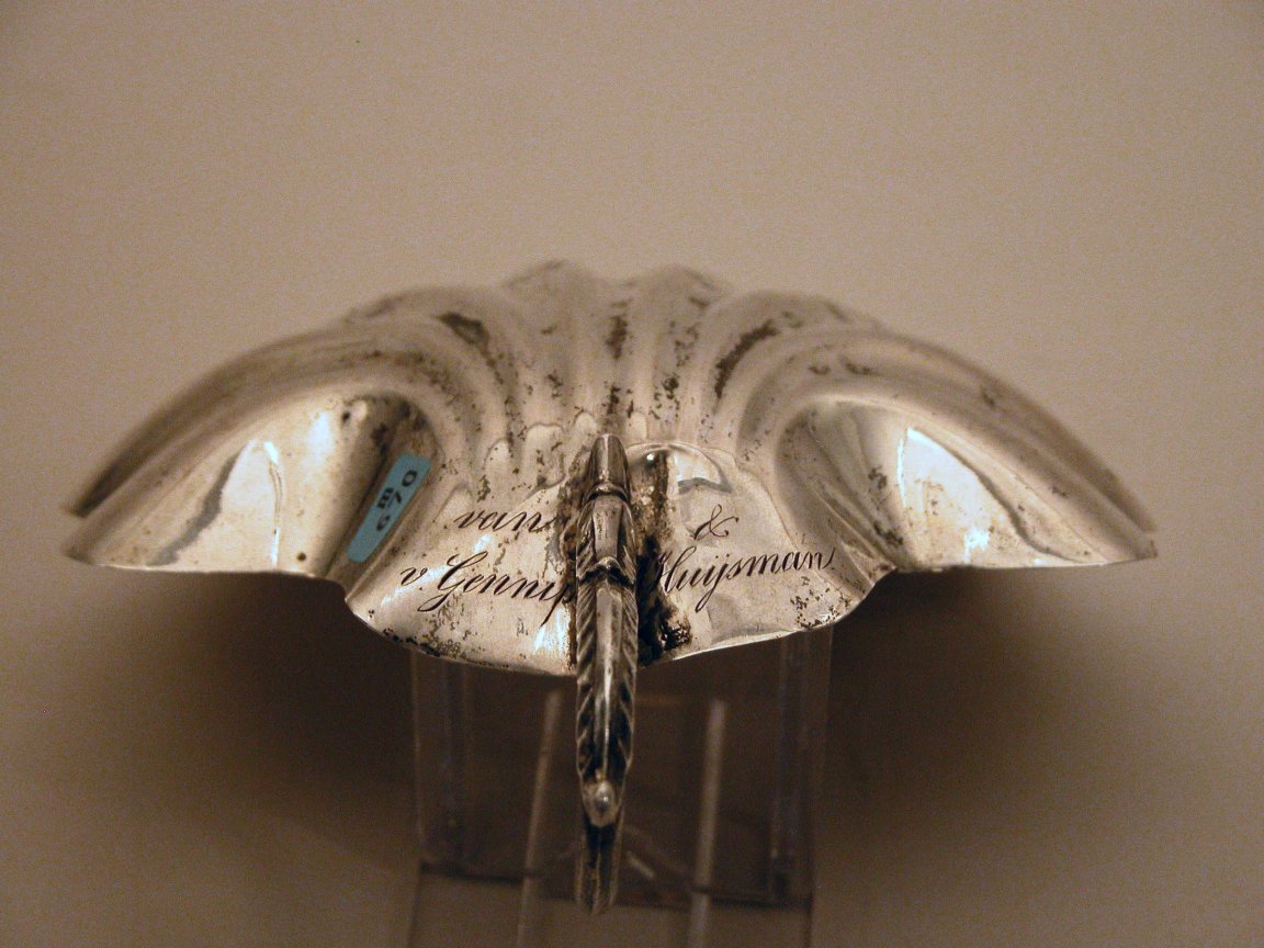 Zilveren doopschelp met "Tot gedachtenis Aan Zijne Doorl. Hoogwd. Monsr. J.F.A. Kistemaker, Bisschop van Uranopolis Ap.s Vic.s te Curaçao, bij Z. D. H. vertrek uit Amsterdam 30 April 1861. Van v. Gennip & Huijsman"