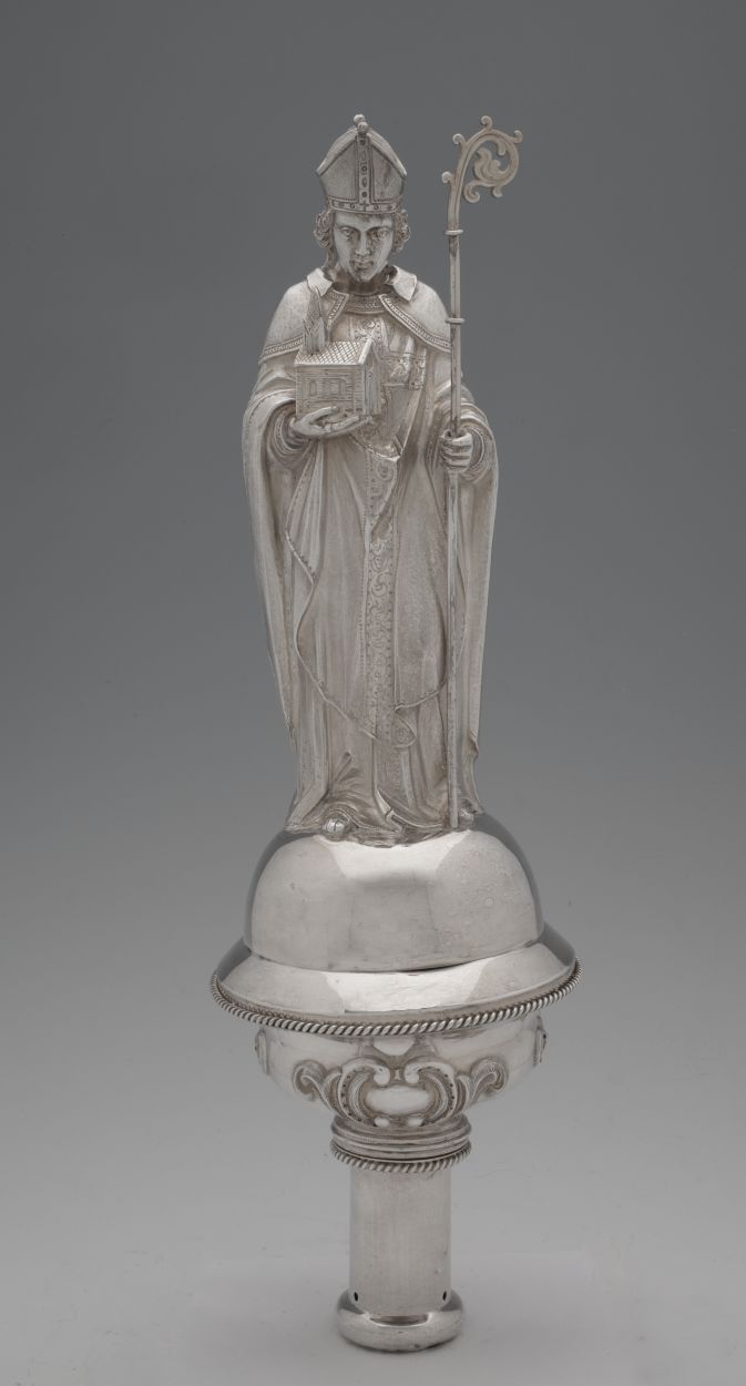 Processiestafbekroning: beeld van H. Willibrordus met kerk op rechterhand en staf in linkerhand