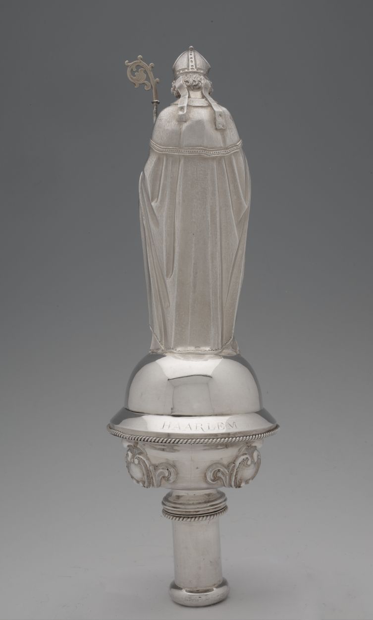 Processiestafbekroning: beeld van H. Willibrordus met kerk op rechterhand en staf in linkerhand. Aan de achterzijde op de rand is "Haarlem" gegraveerd.
