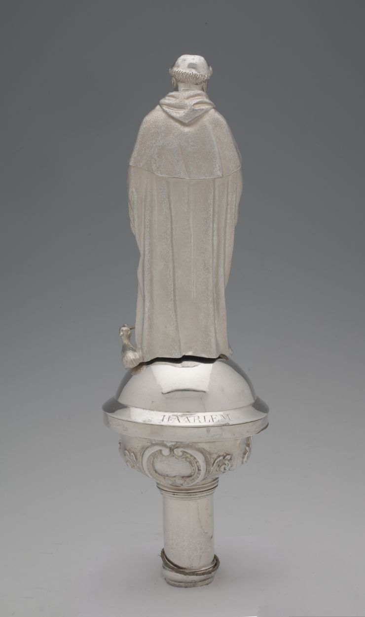 Processiestafbekroning: beeld van H. Dominicus met boek in linkerhand en hond aan zjin voeten. Aan de achterzijde op de rand is "Haarlem" gegraveerd.