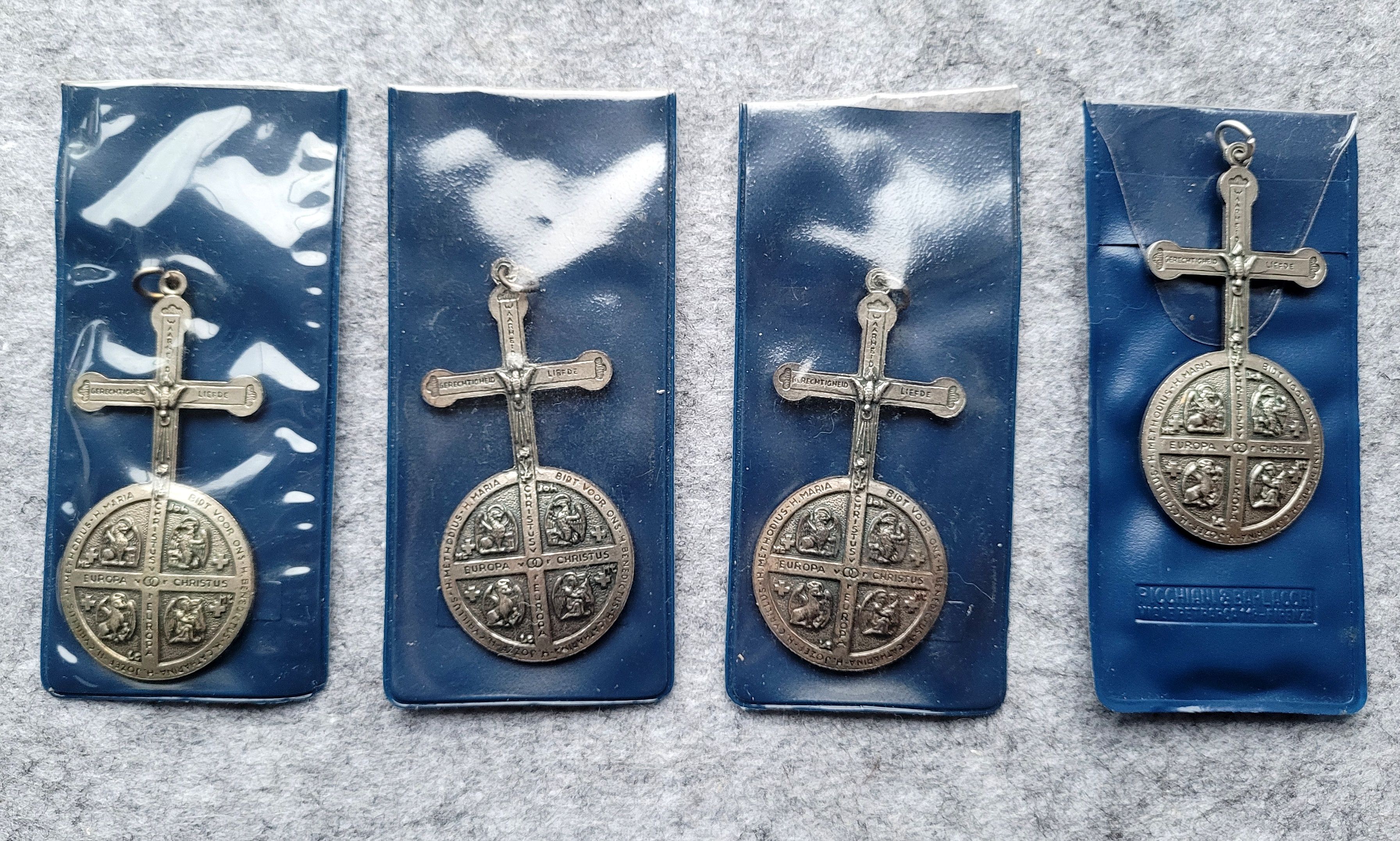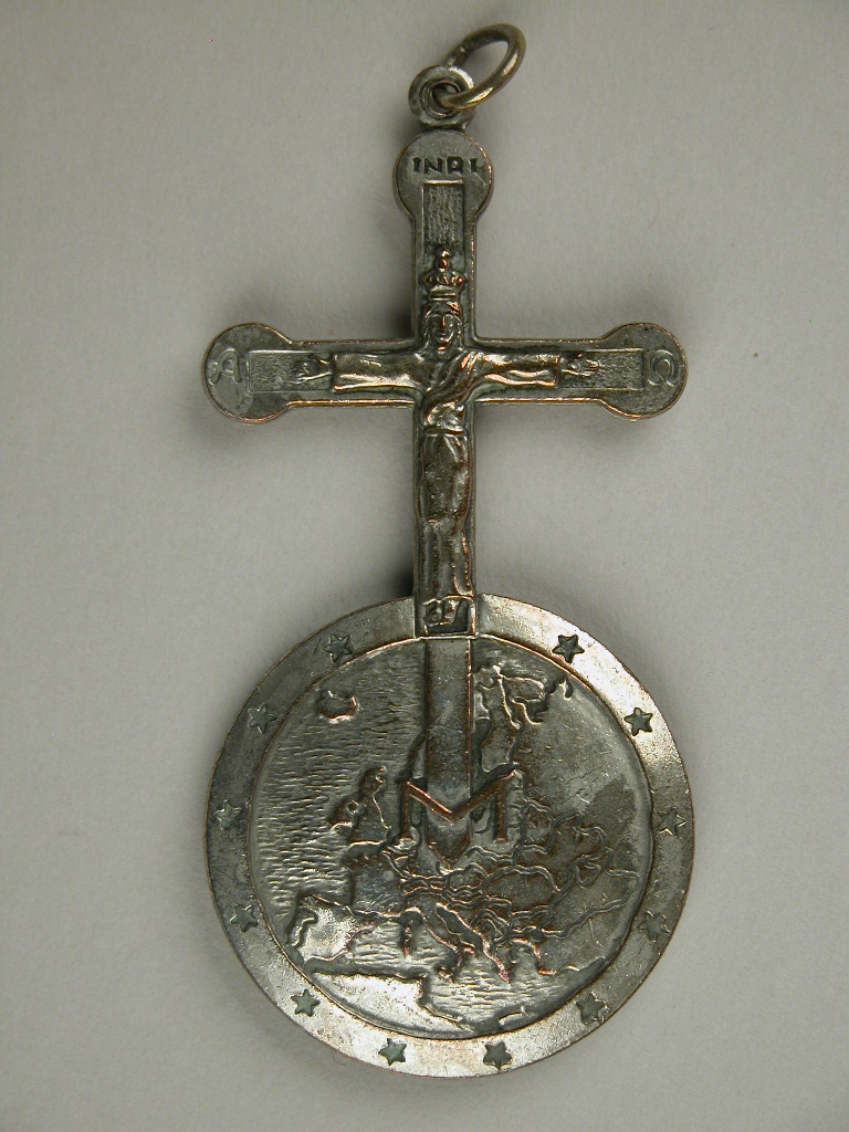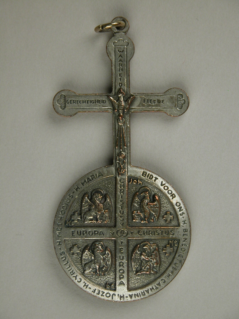 Rijksappel met aan het kruis (met INRI, alpha en omega) een gekroonde Christus. De bol toont een kaart van Europa, omgeven door een rand van 12 sterren. Kz.: Op de kruisarmen de teksten 'Gerechtigheid', 'Waarheid' en 'Liefde', met op de kruising een duif. De bol is in vier vlakken verdeeld, waarin symbolen van de vier ...
