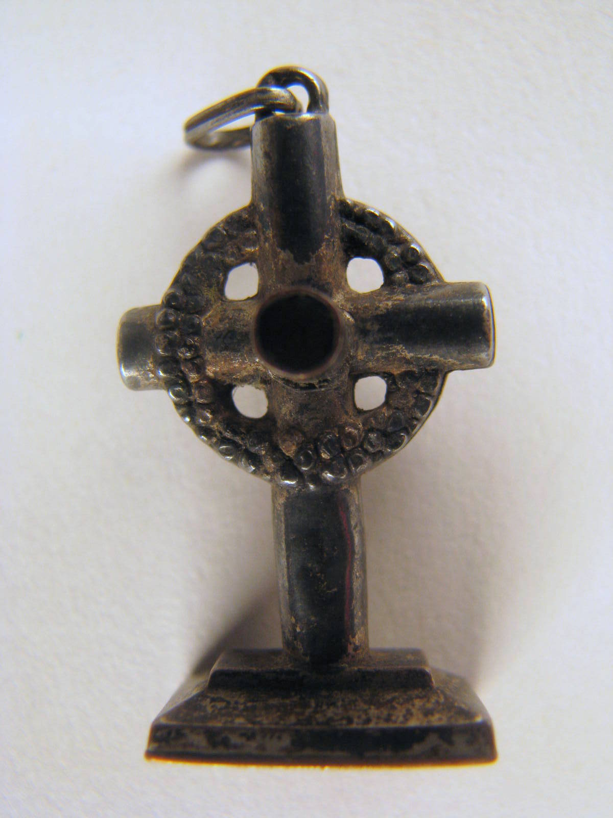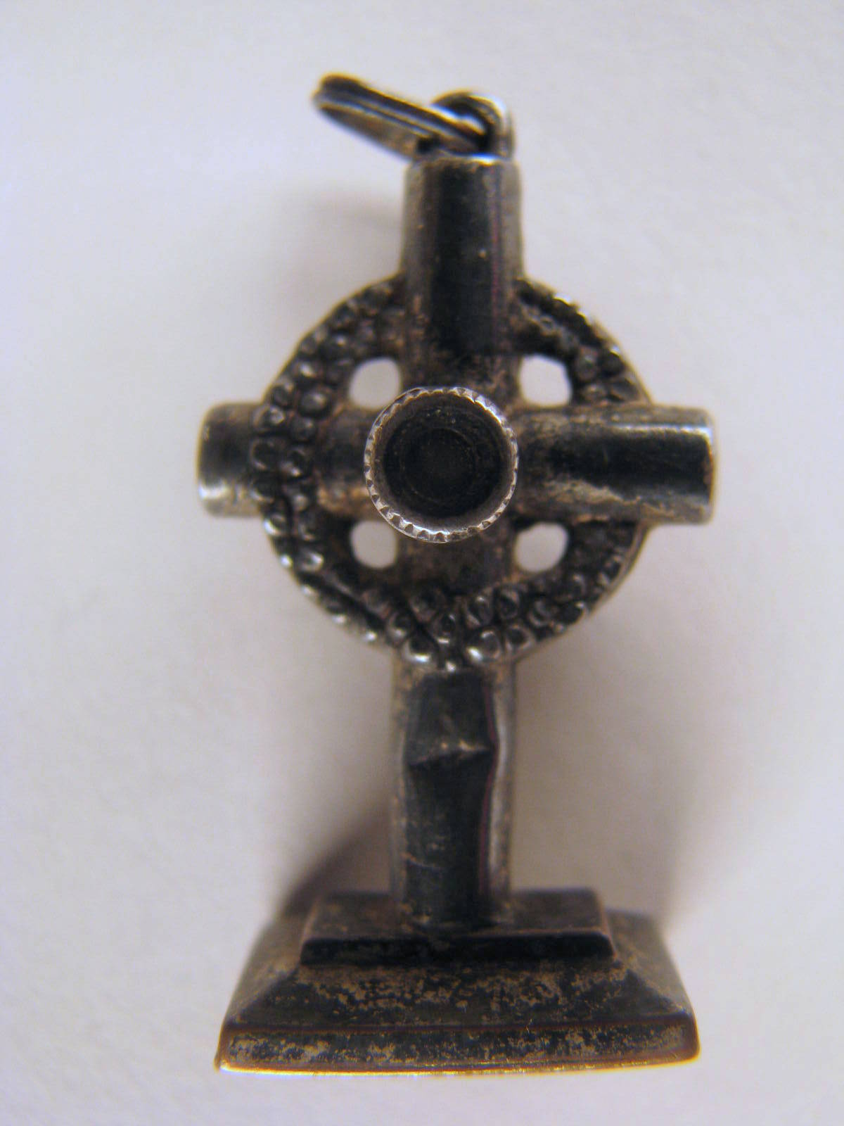 Zilveren(?) hanger in de vorm van een miniatuur reliekhouder: een kruisje op een voet met een rozenkrans eromheen. De reliekhouder heeft aan twee zijden een rond glaasje