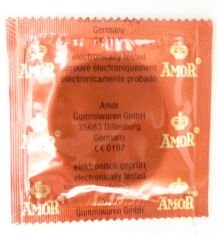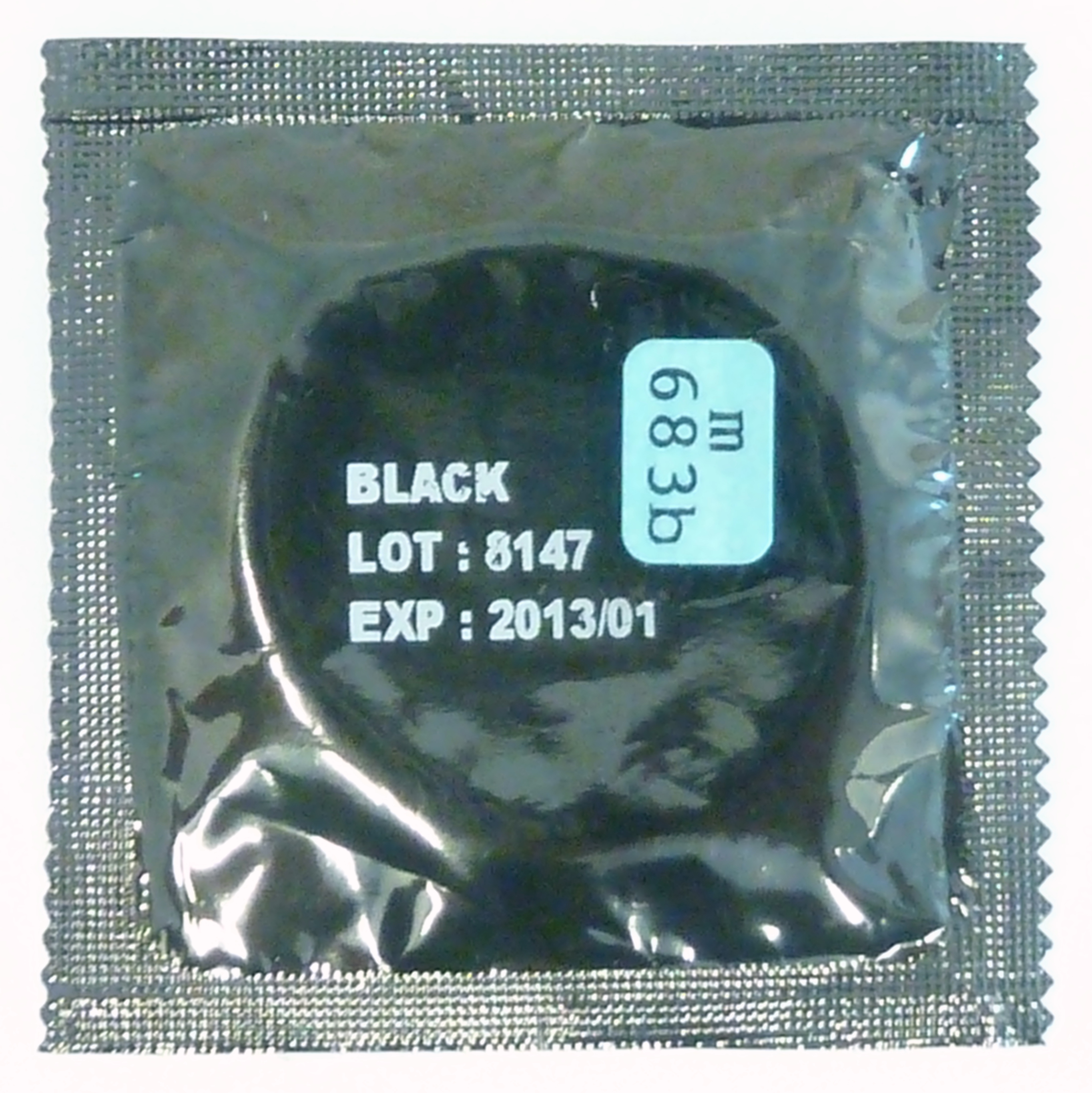Zwarte condoom in rood/zwarte verpakking van metaalfolie, als reserveonderdeel bij RMCC m683a