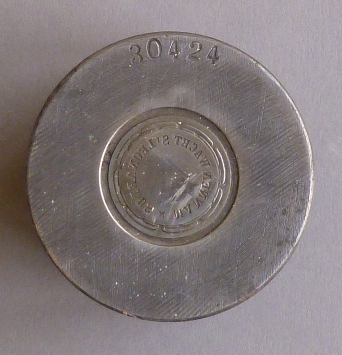 Stempel voor achterzijde van penning met "Mannenwacht St. Leonardus", op voorzijde medaille kelk en hostie in stralenkrans