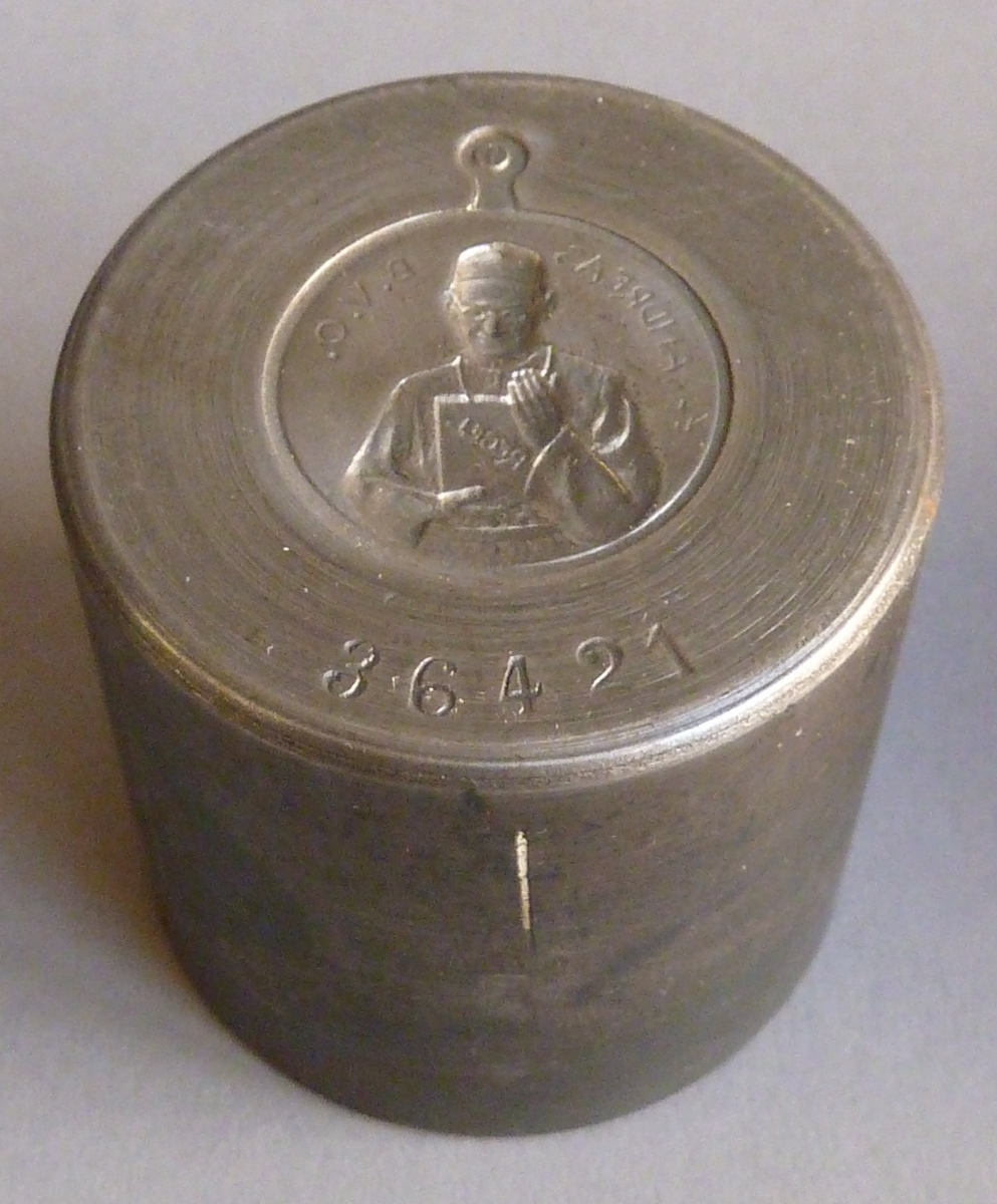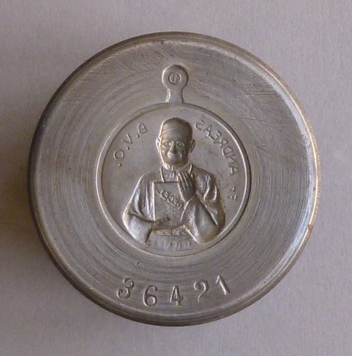 Stempel voor voorzijde van devotiepenning met "Fr. Andreas B.V.O." en Andreas met 'regel', achterzijde penning met "Eenvoud onderwerping versterving"