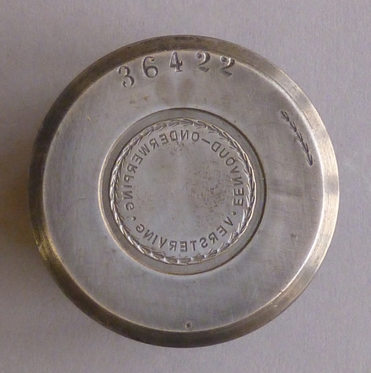Stempel voor achterzijde van devotiepenning met "Eenvoud onderwerping versterving", voorzijde penning met "Fr. Andreas B.V.O." en Andreas met 'regel'