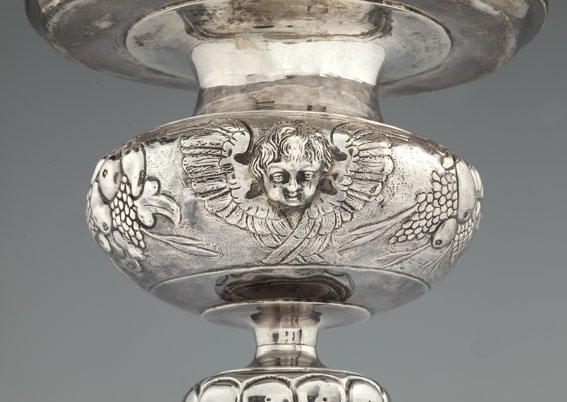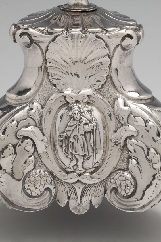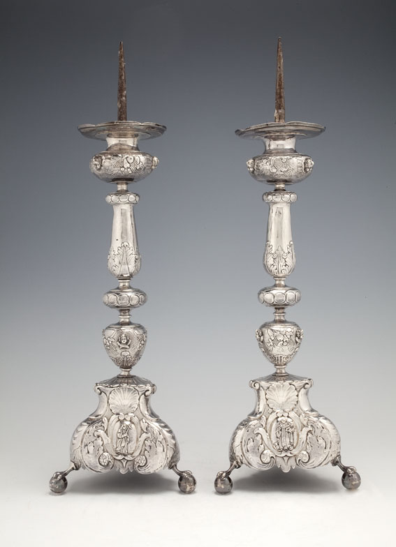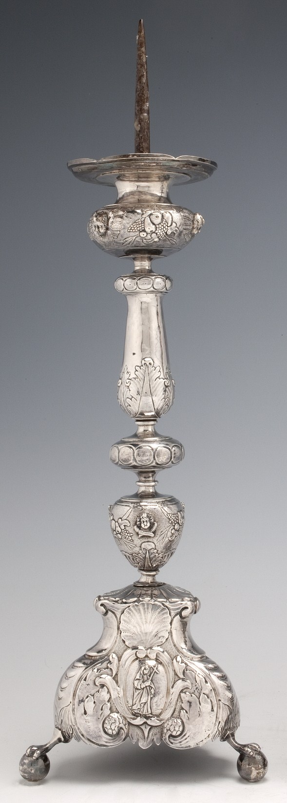Zilveren penkandelaar op driehoekige voet met drie balklauwpoten, gedecoreerd met drie gedreven florale medaillons met St. Catharina van Siena, St. Jacobus de Meerdere en St. Margaretha. De balustervormige stam heeft een gladde ronde vetvanger met spitse kaarsenhouder en is versierd met gedreven cherubijnen, hangende vruchten met bloem, guirlandes en gestileerde acanthus bladmotieven.
