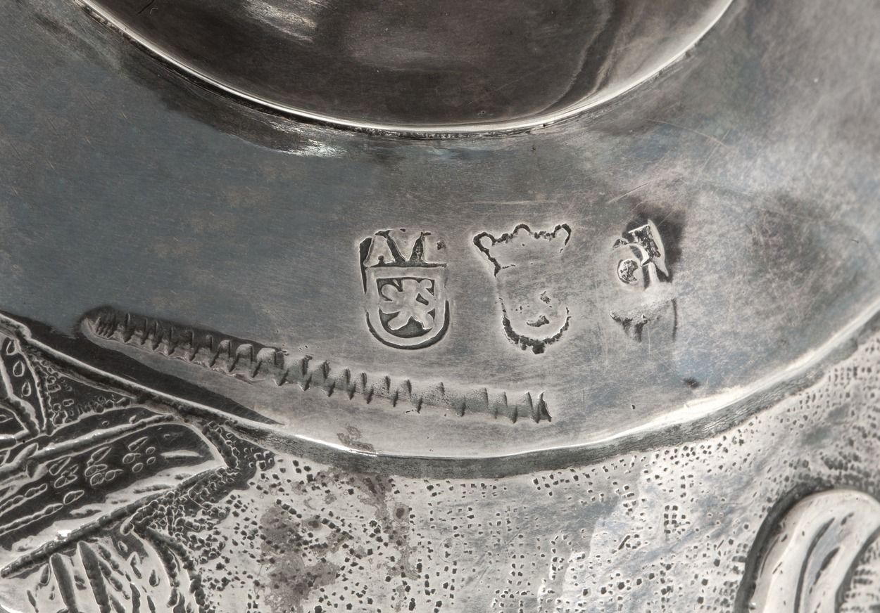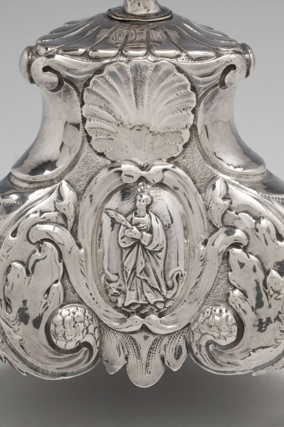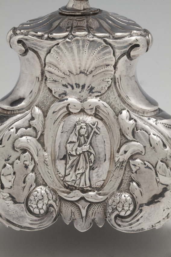 Penkandelaar op driehoekige voet met drie balklauwpoten, gedecoreerd met drie gedreven florale medaillons met St. Catharina van Siena, St. Jacobus Maior en St. Margaretha