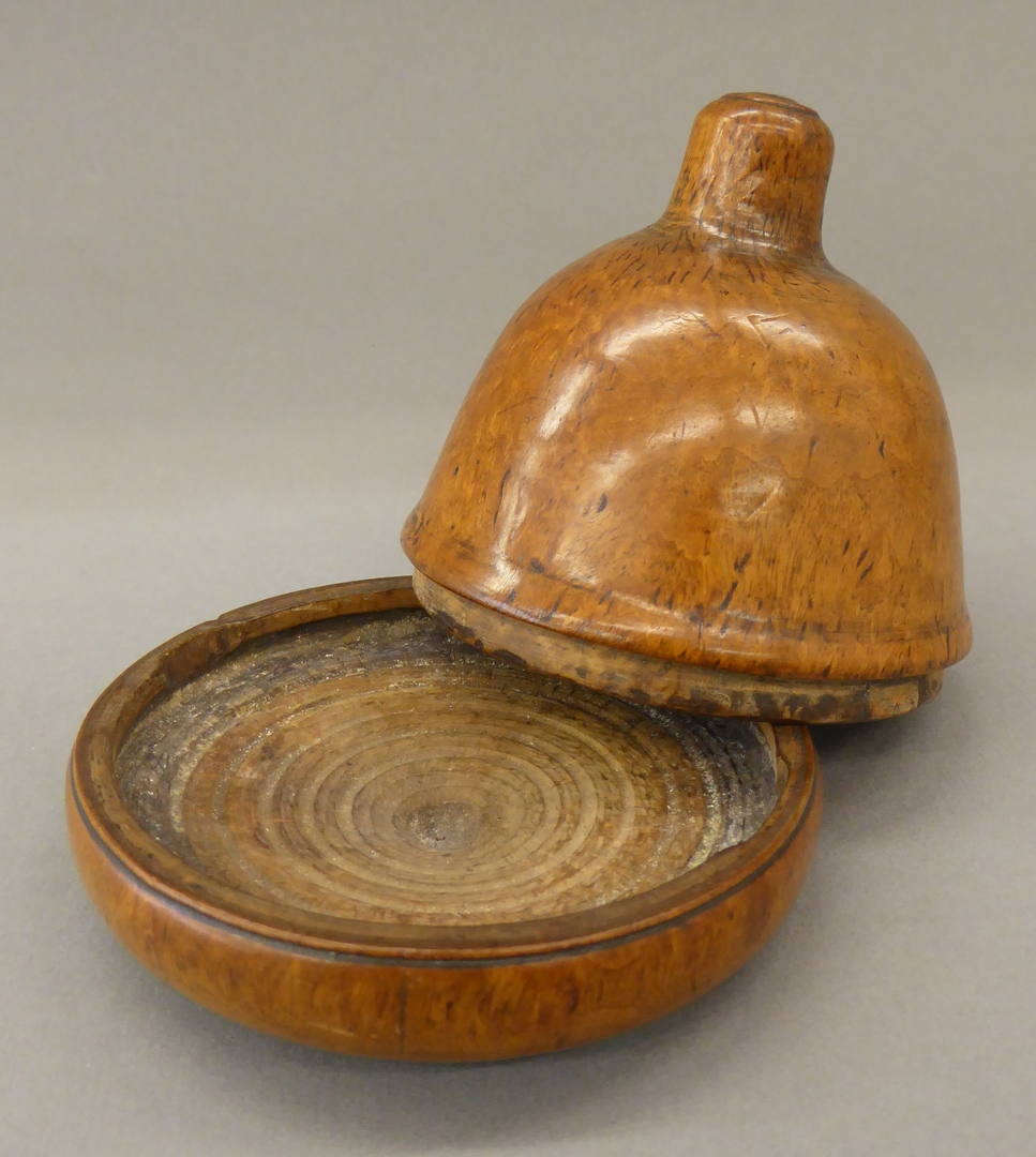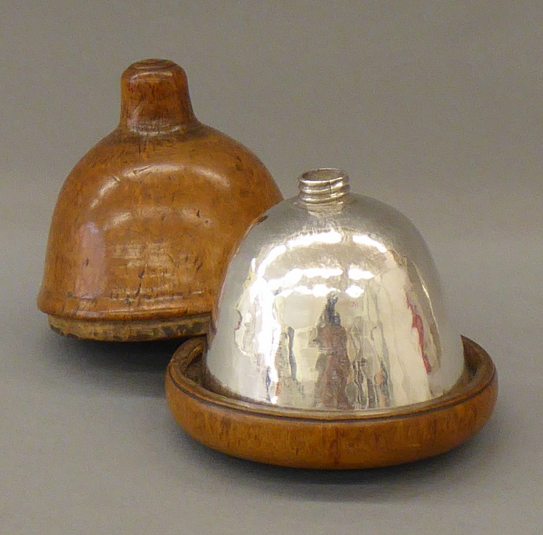Klokvormige, mahoniehouten foedraal met cilindrische greep, die inschietend in de losse bodem wordt geplaatst.