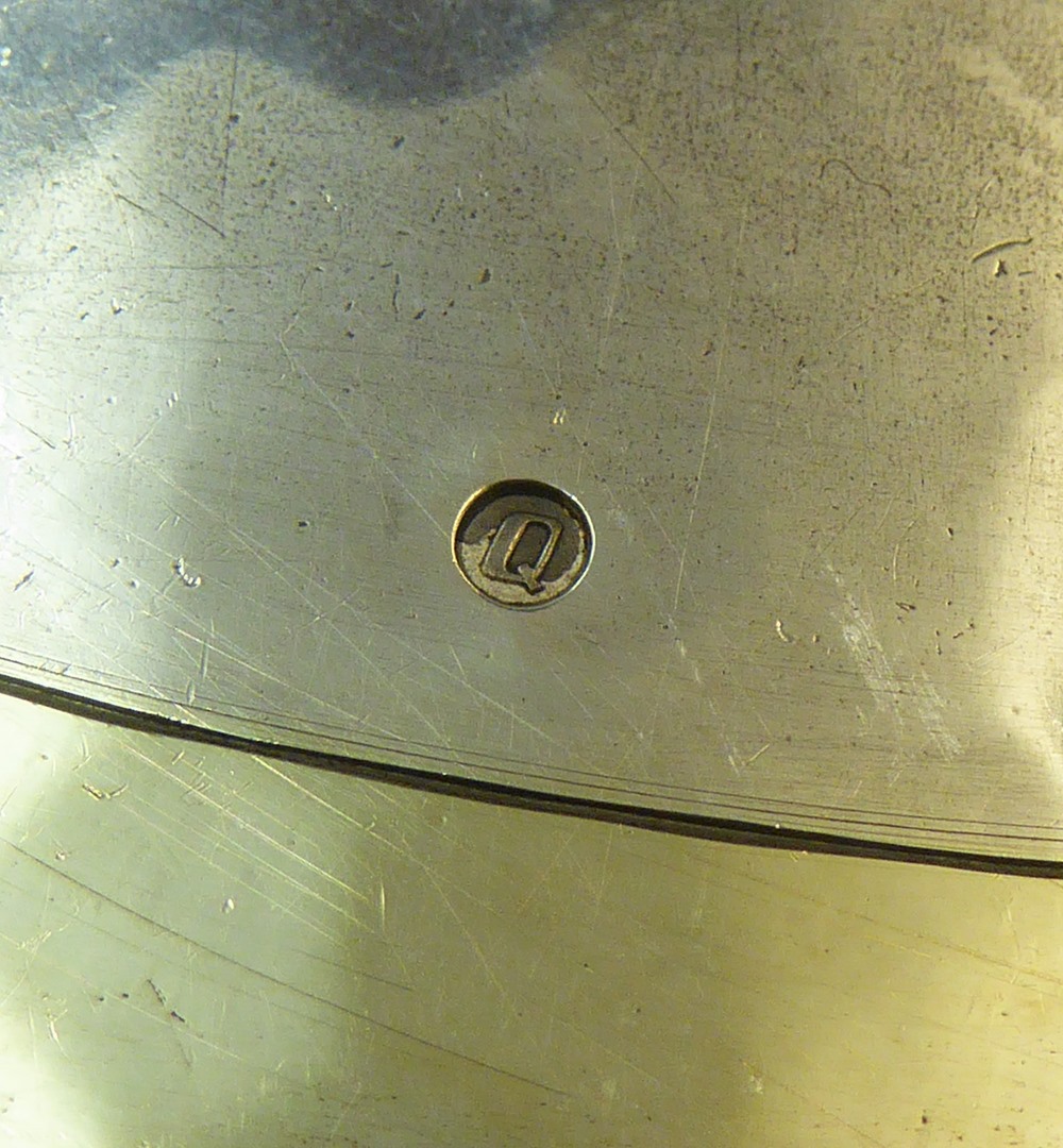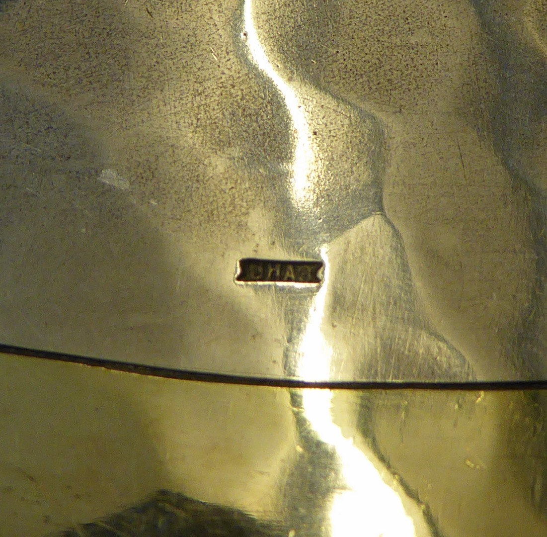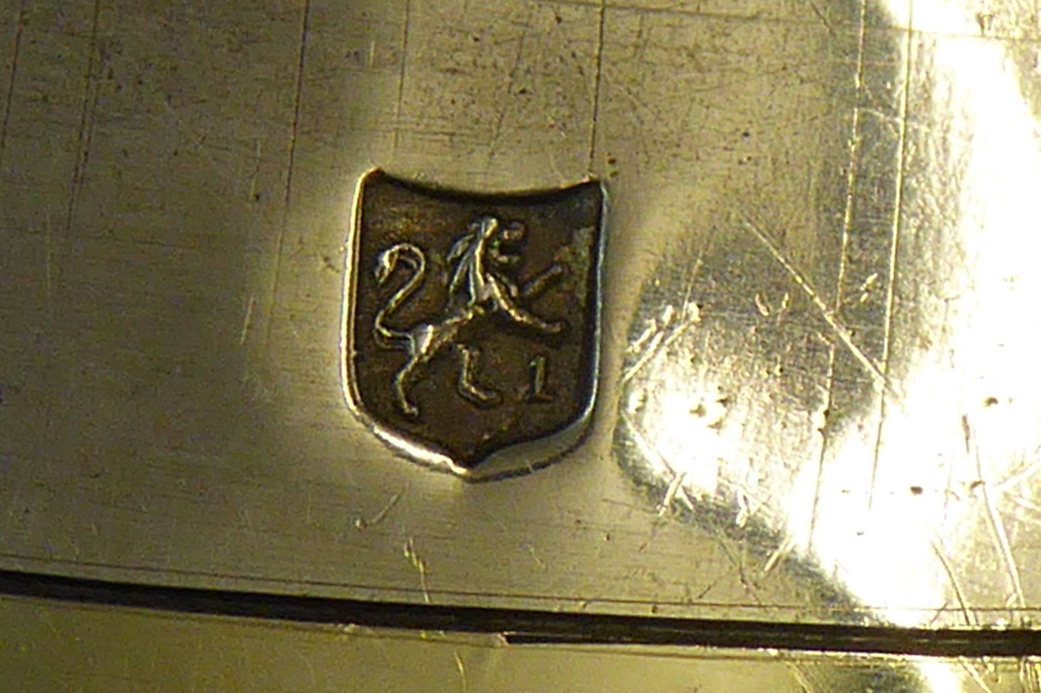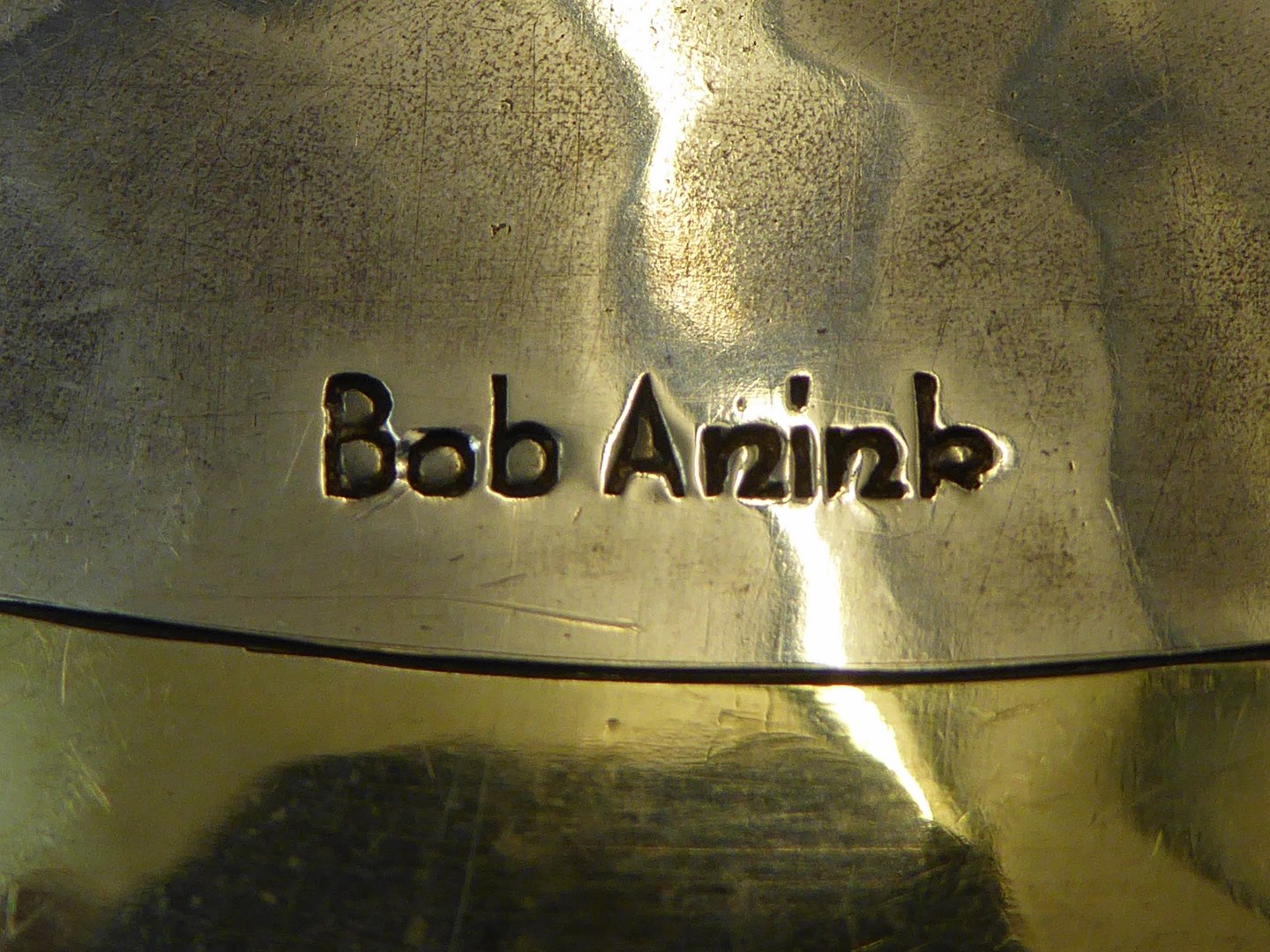 -klimmende leeuw + 1 (= zilver, eerste gehalteteken) -Minervakopje met letter-A (keurkamerstempel Amsterdam) -letter-Q (= jaarletter 1951) -JHA3 in liggende rechthoek met ingekeepte korte zijden (= meesterteken J.H.J.A.M. Anink, Amsterdam/ Blaricum, 1933-1996) - stempel 'Bob Anink' (=signatuur)