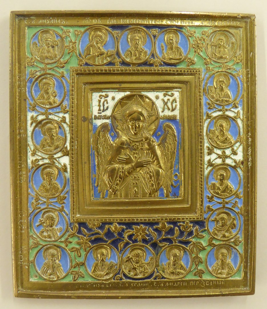 Christus, Engel van het Zalige Zwijgen met achttien figuren op rand, waaronder engelen en apostelen met Deesis (voorbede-rij) en heiligen: Bovenste rij: Aartsengel Michael, Moeder Gods, Christus Pantokrator, Johannes de Voorloper, aartsengel Gabriël 2e rij: Apostelen Petrus en Paulus 3e rij: Kerkvaders Basilius de Grote en Gregorius de Grote (van Nazianze) 4e rij: Kerkvader Johannes ...