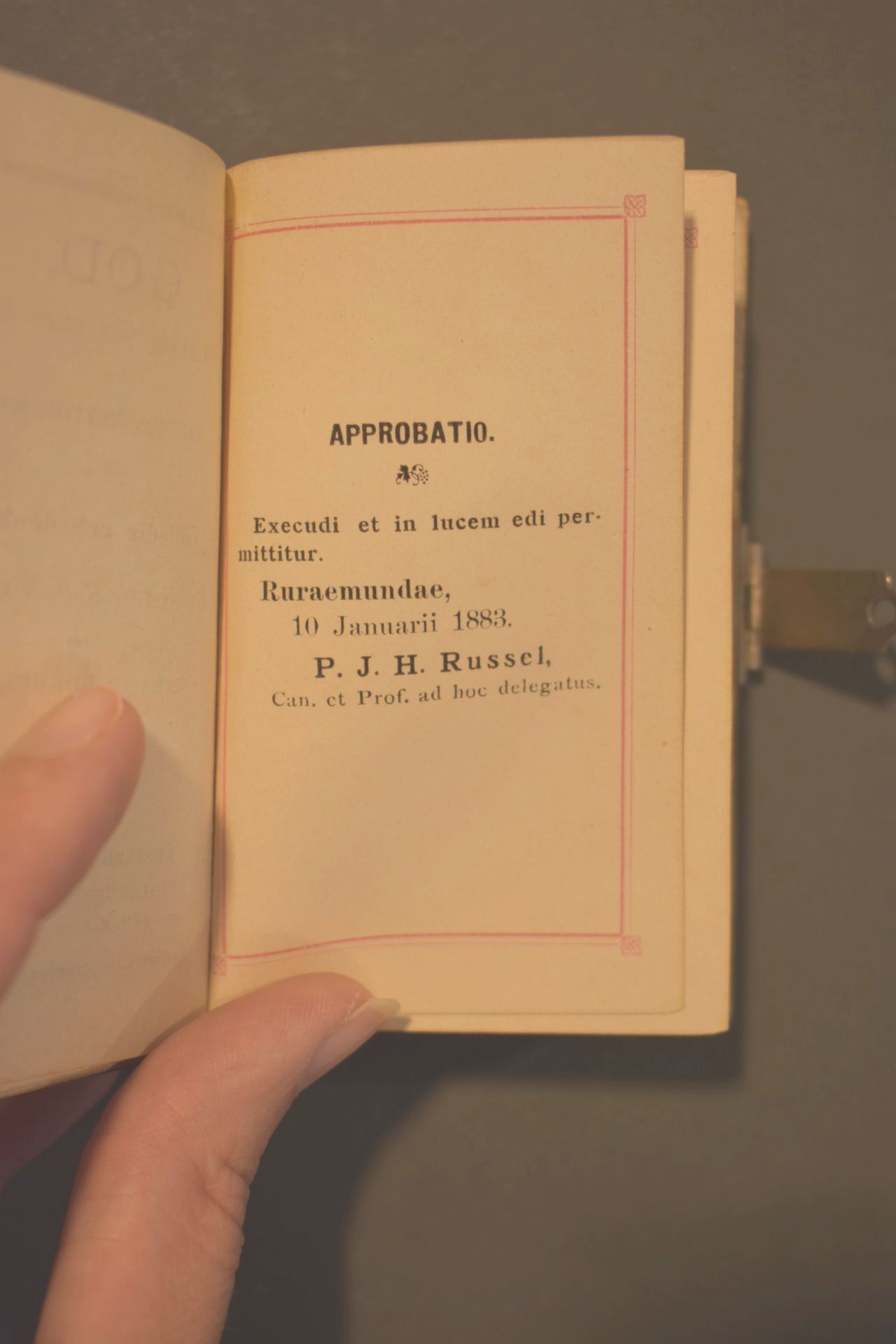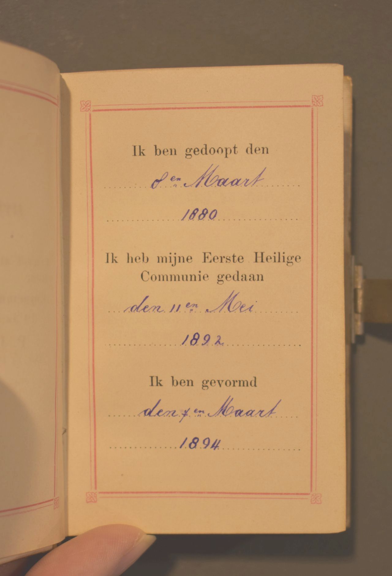 In het boek zitten twee decoratieve gravures en de snede is verguld. De voorgedrukte eigendomspagina is ingevuld met blauwe vulpen en vermeld het volgende 'Ik ben gedoopt den / 8en maart / 1880 / Ik heb mijne Eerste Heilige / Communie gedaan / den 11en mei / 1892 / Ik ben gevormd / den 7en ...