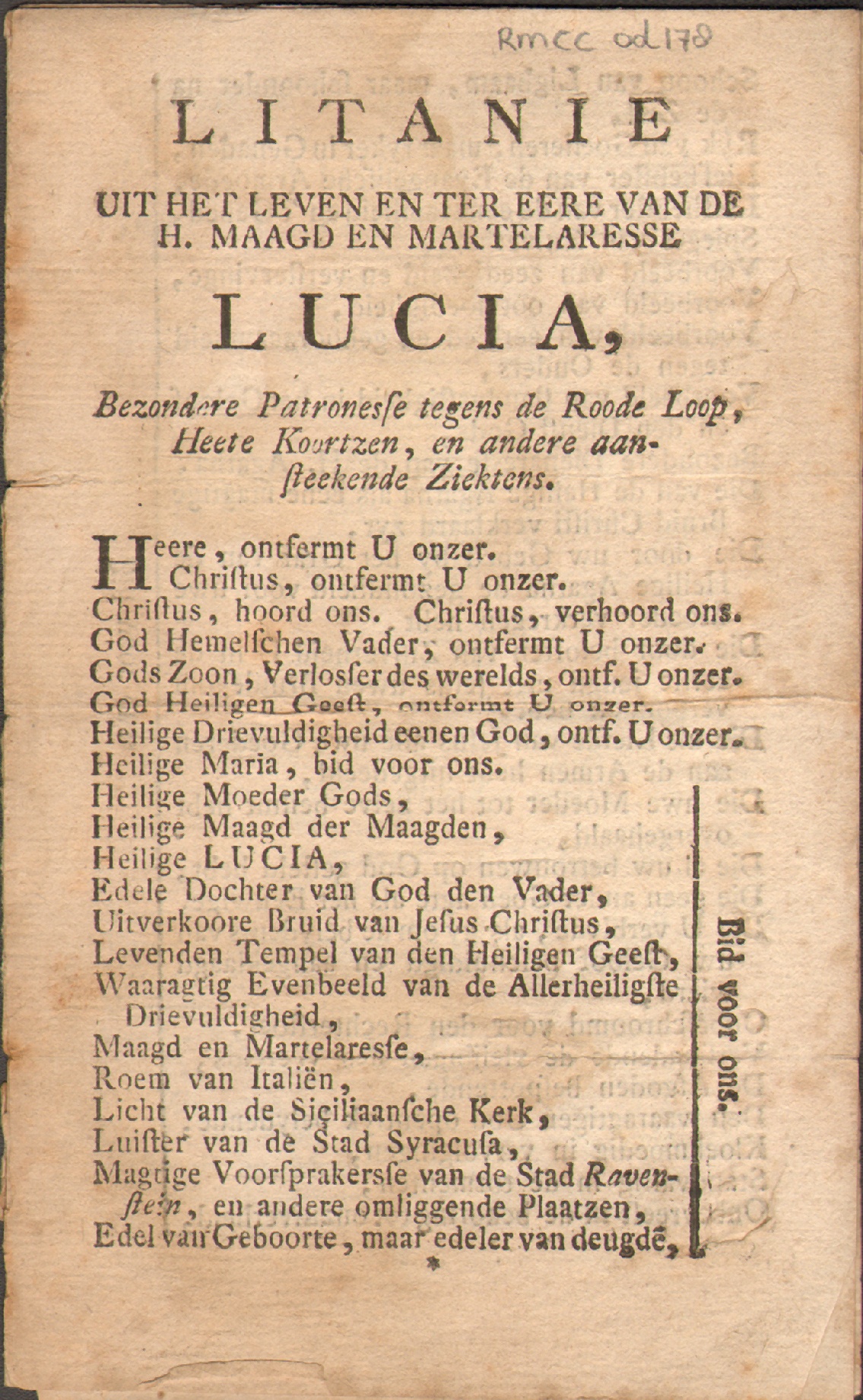 Litanie uit het leven en ter eere van de h. maagd en martelaresse Lucia, bezondere patronesse tegens de roode loop, heete koortzen, en andere aansteekende ziektens