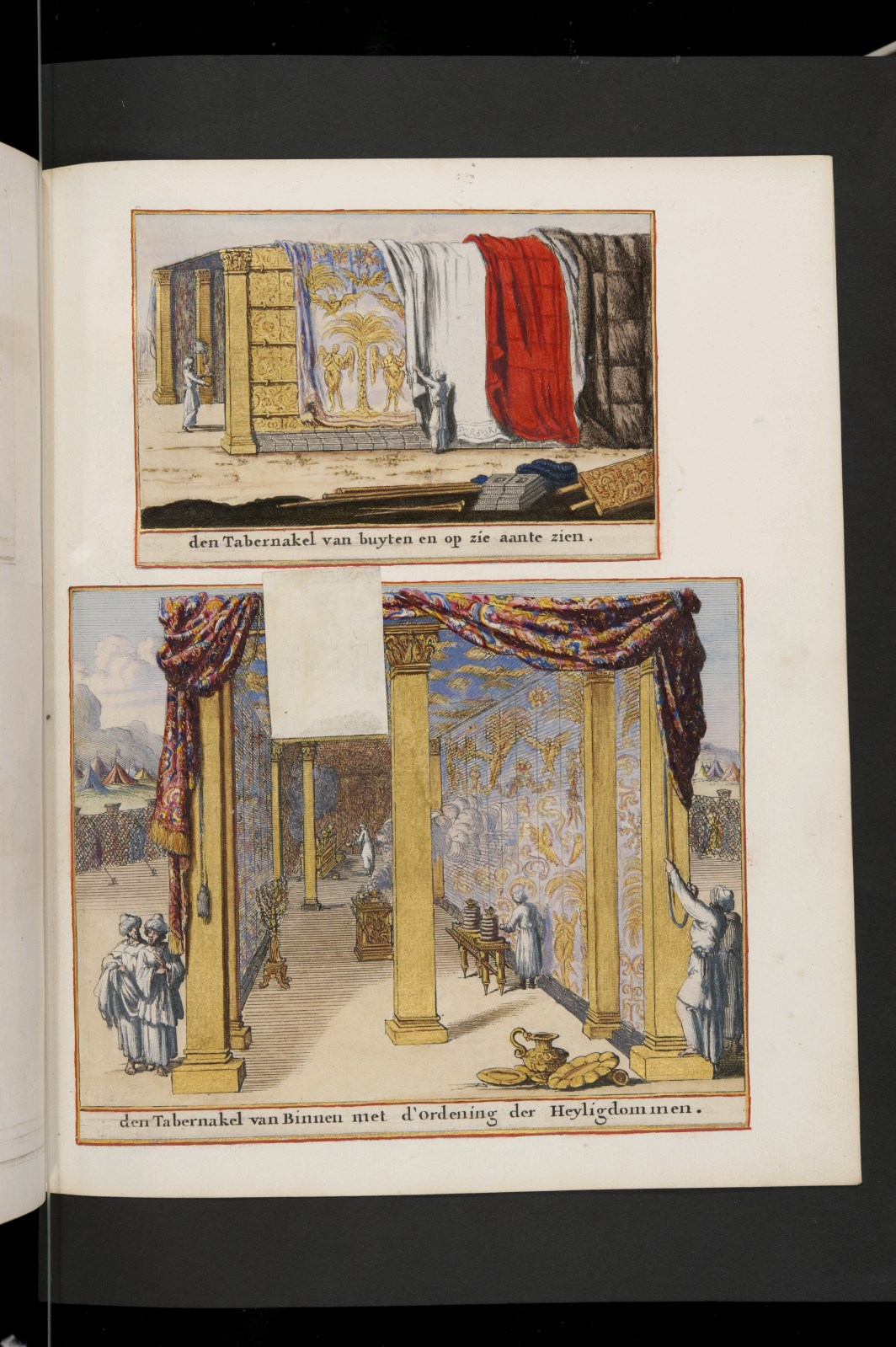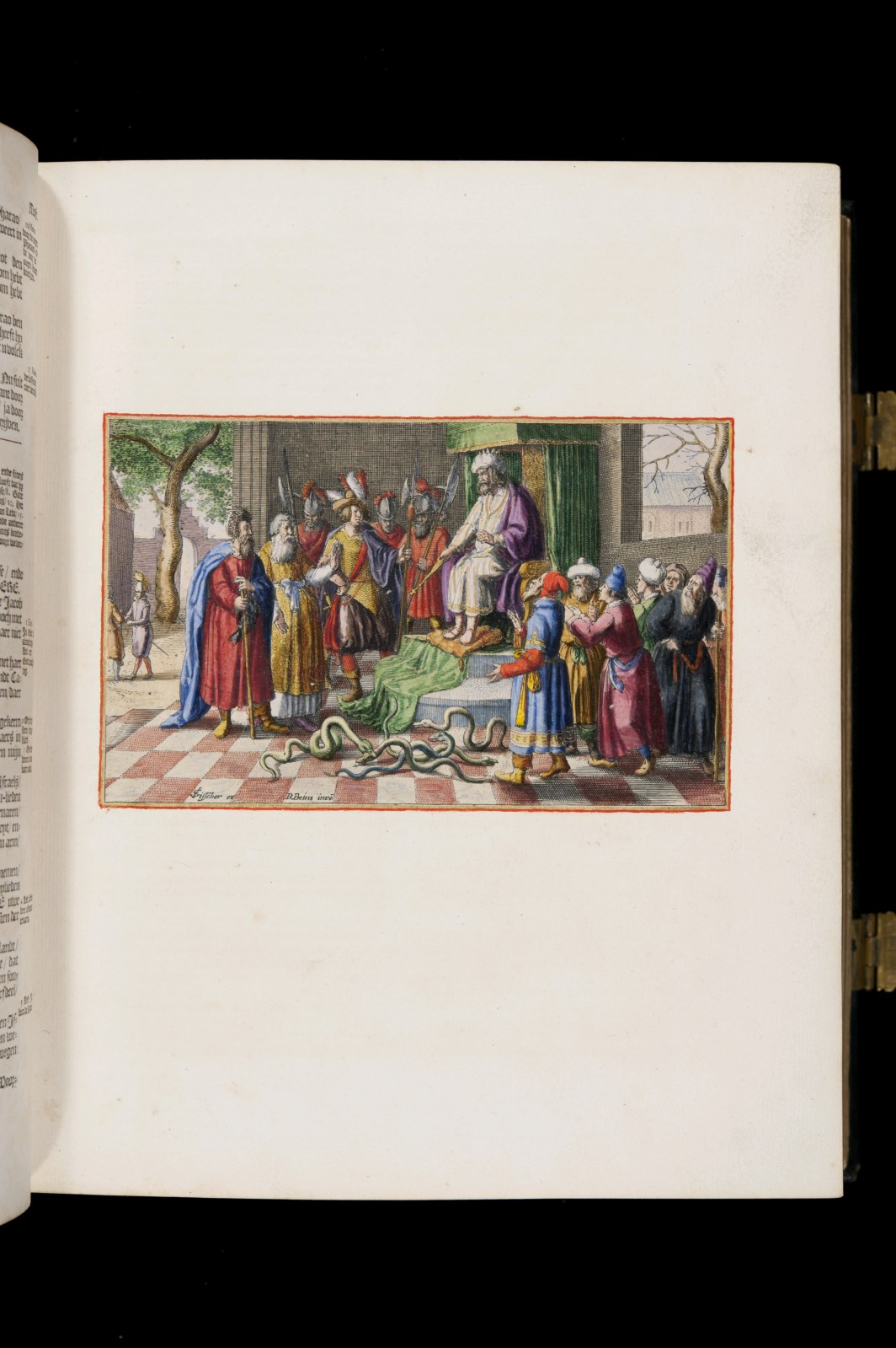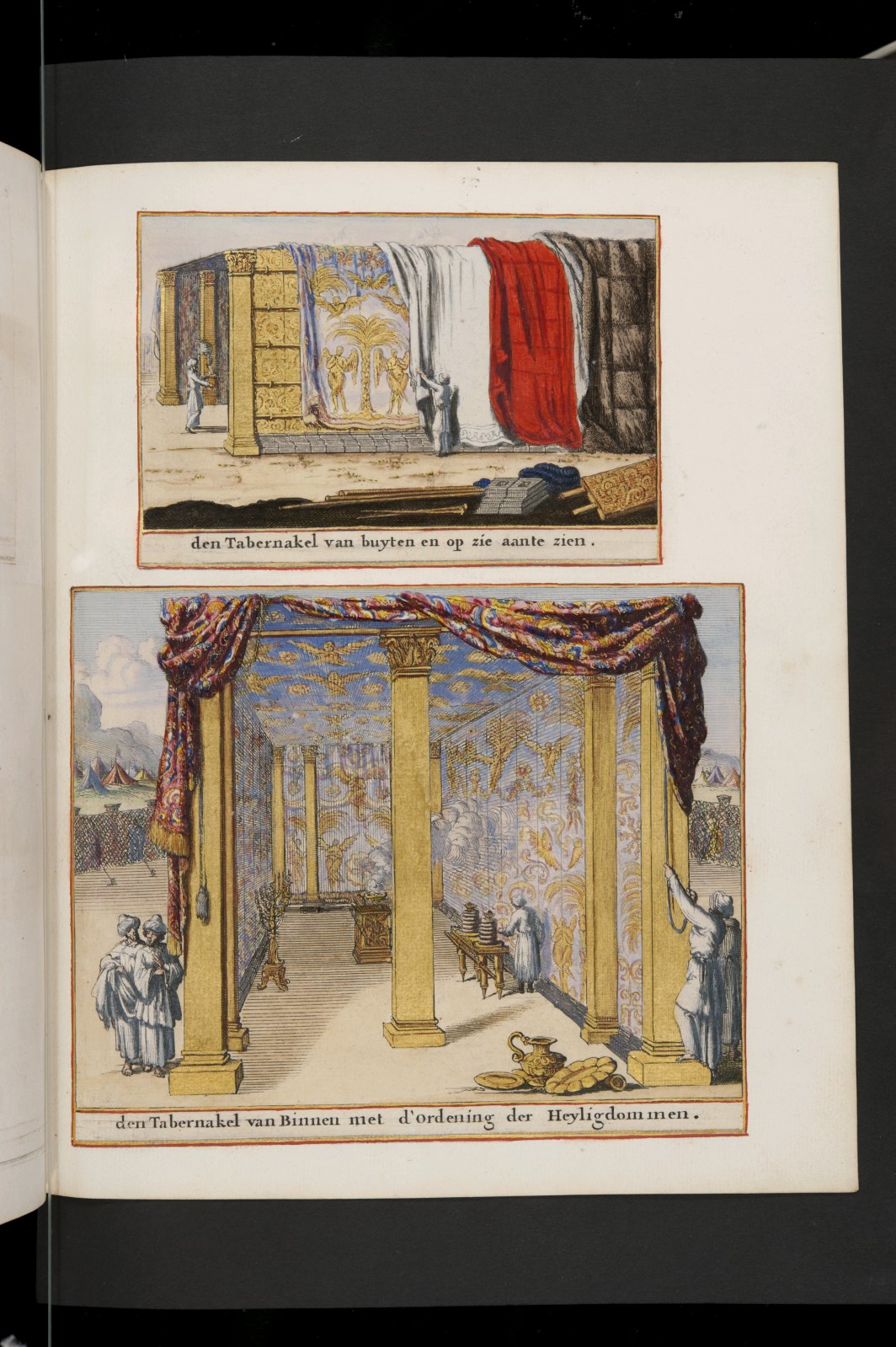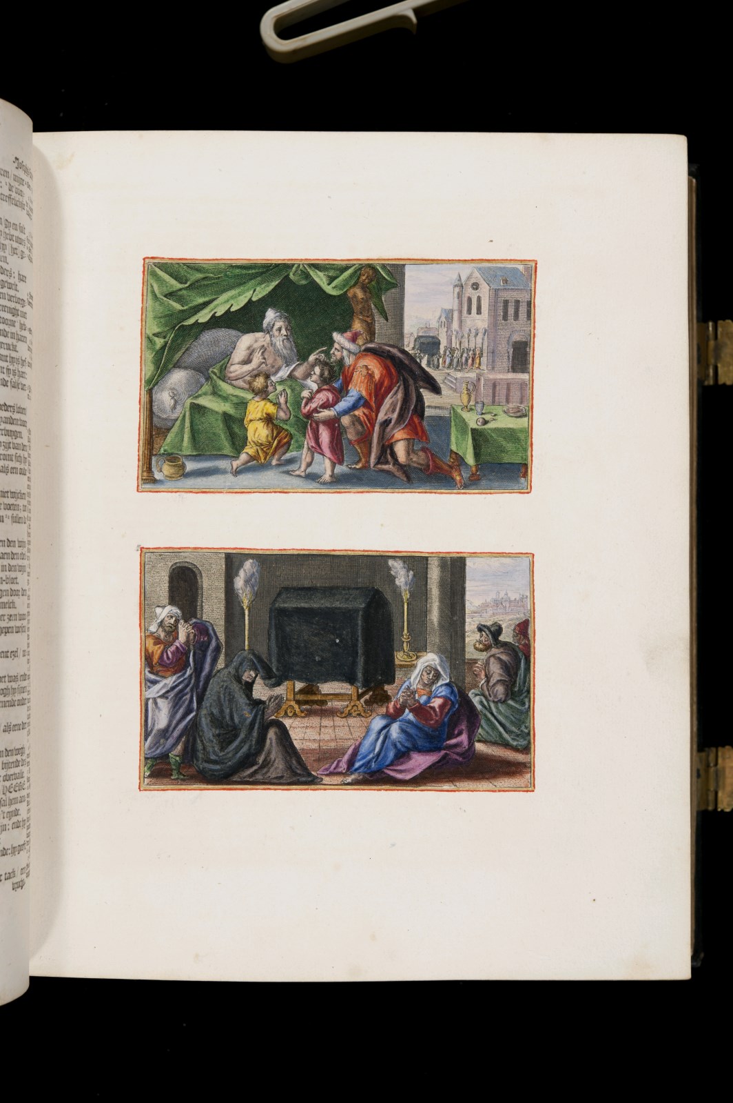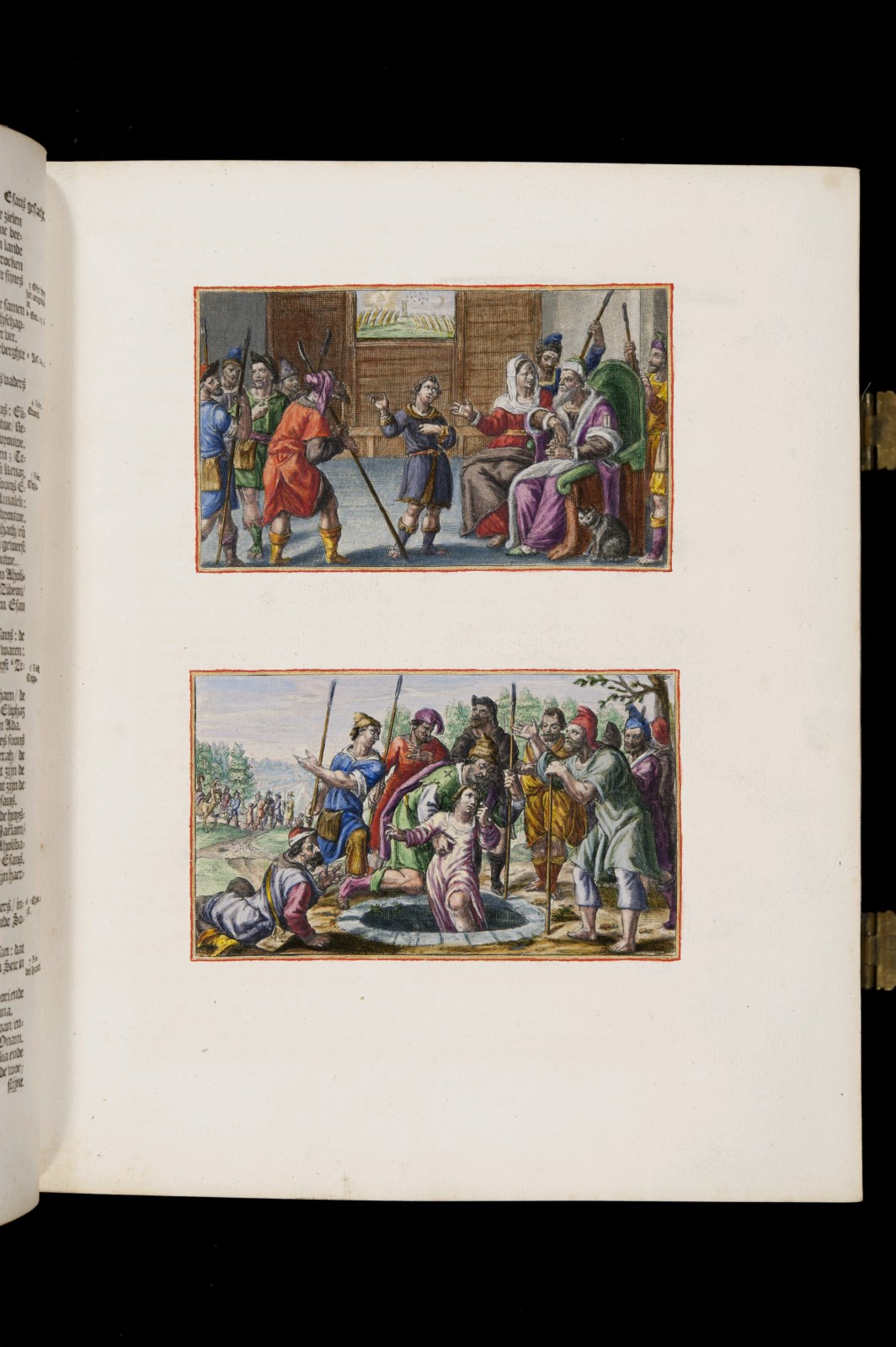 Het boek heeft 150 ingekleurde gravures van Hendrik Goltzius, Jacob Matham, de Mariaprenten van Nicolaas Visscher en anderen. Alle illustraties zijn handgekleurd en goudgehoogd door Dirk Jansz van Santen en de snede is verguld. De bruine segrijn leren band die later zwart is geverfd, is versierd met een dubbel blind lijnkader op het voor- en ...