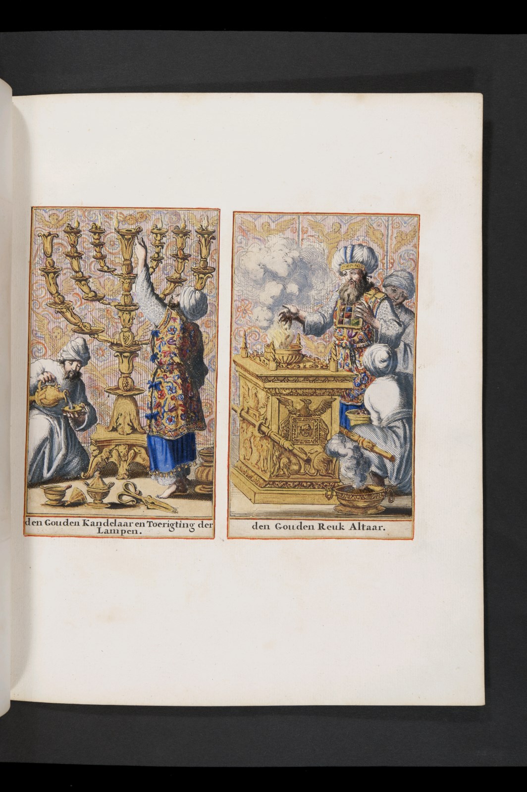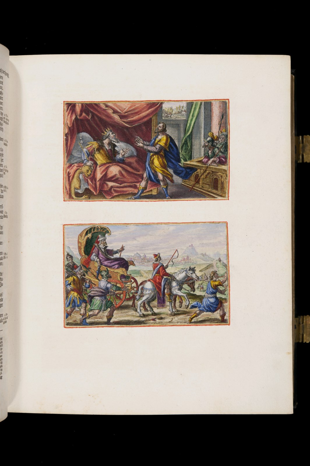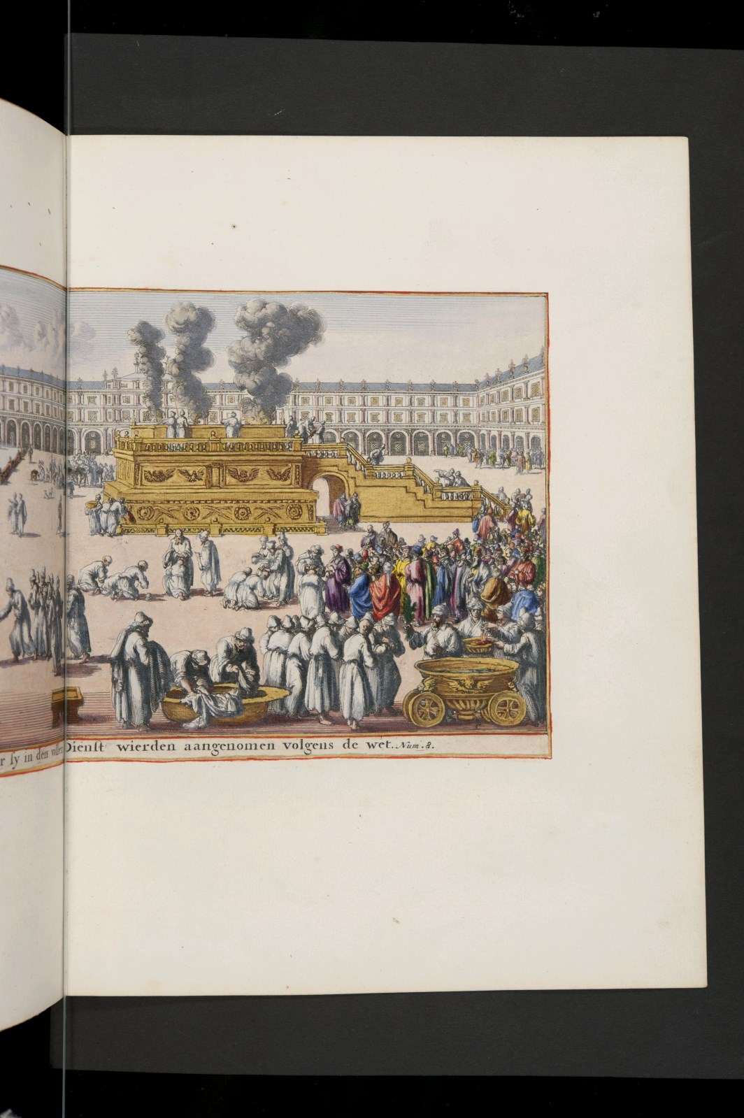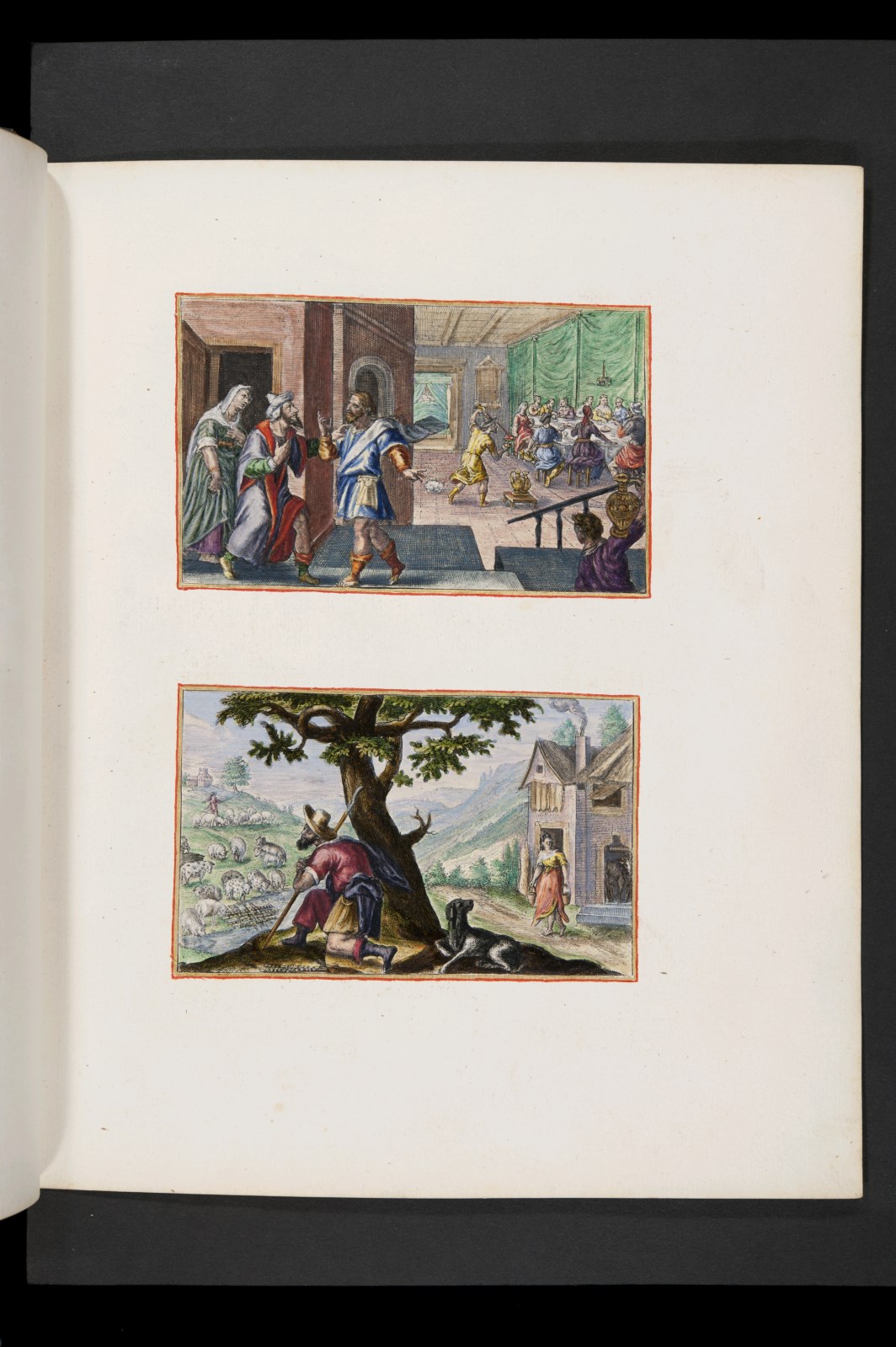 Het boek heeft 150 ingekleurde gravures van Hendrik Goltzius, Jacob Matham, de Mariaprenten van Nicolaas Visscher en anderen. Alle illustraties zijn handgekleurd en goudgehoogd door Dirk Jansz van Santen en de snede is verguld. De bruine segrijn leren band die later zwart is geverfd, is versierd met een dubbel blind lijnkader op het voor- en ...