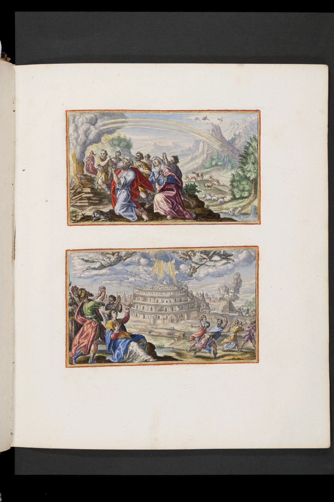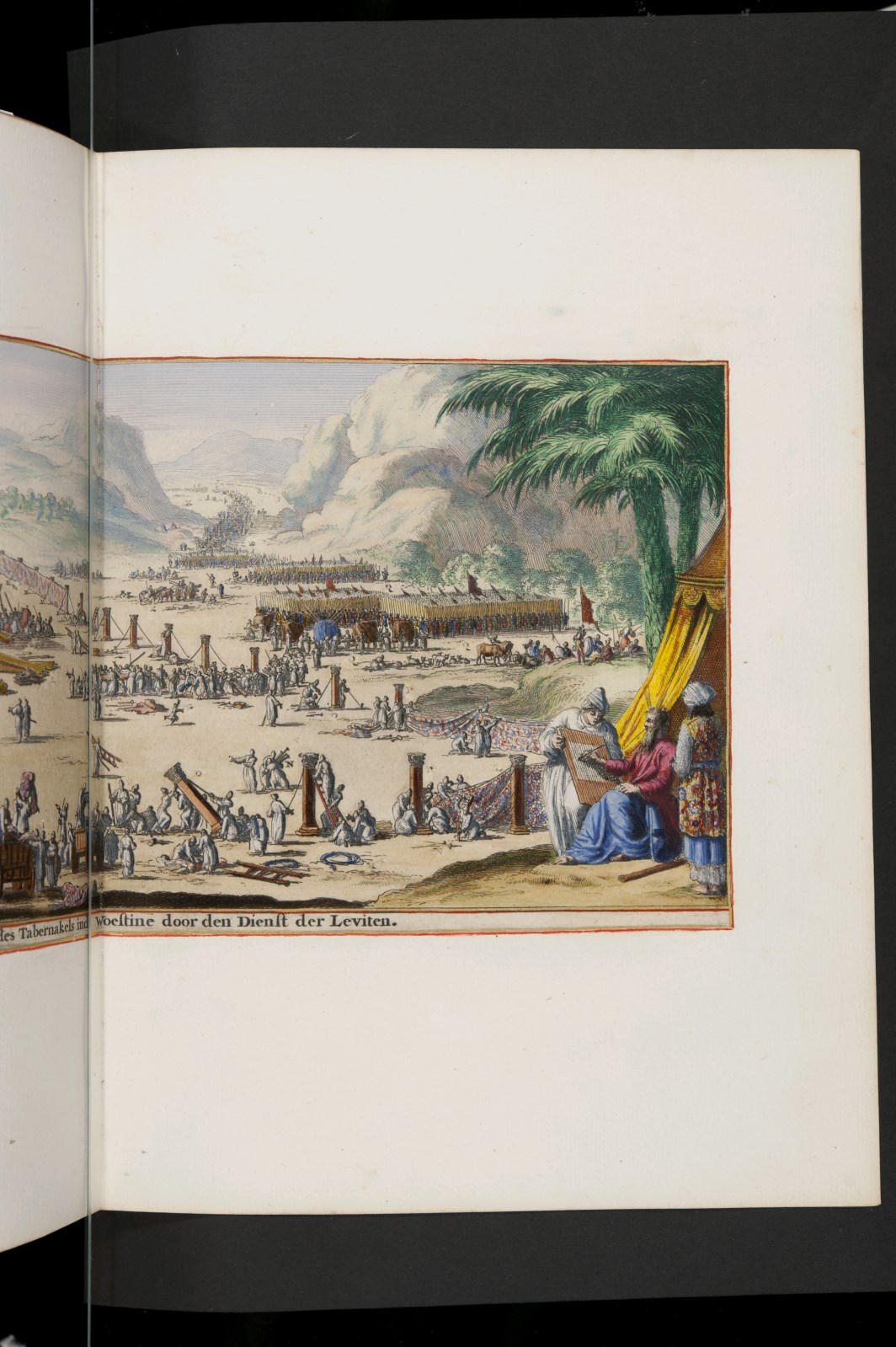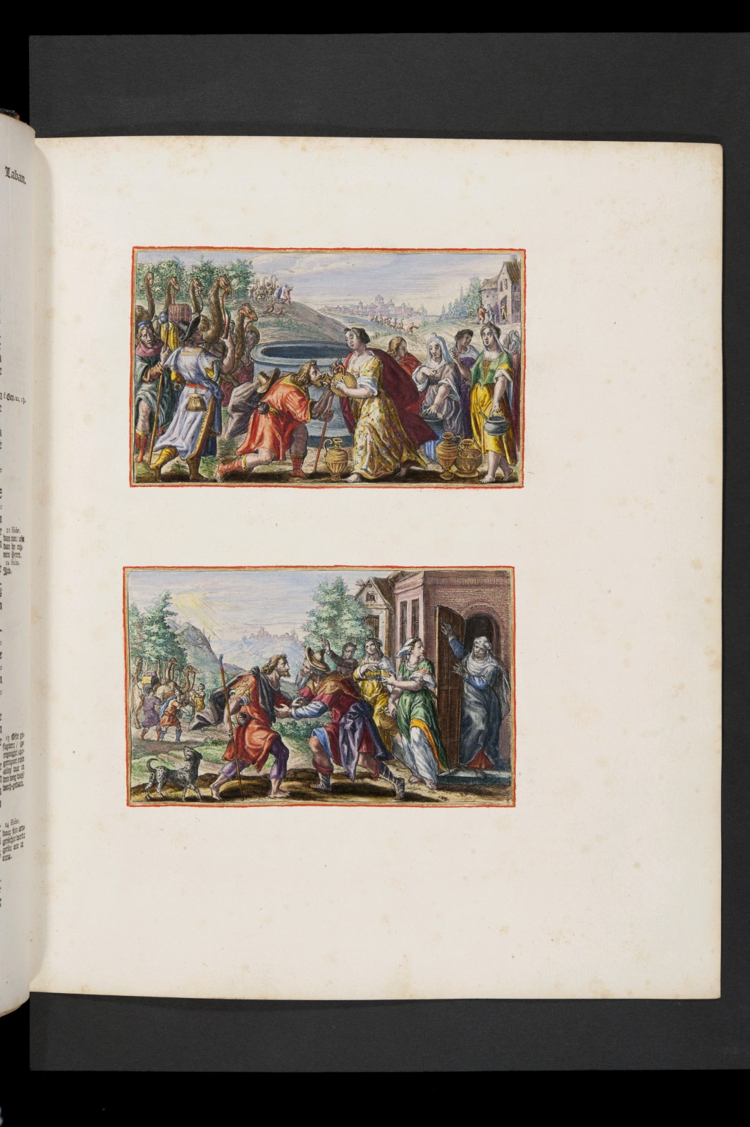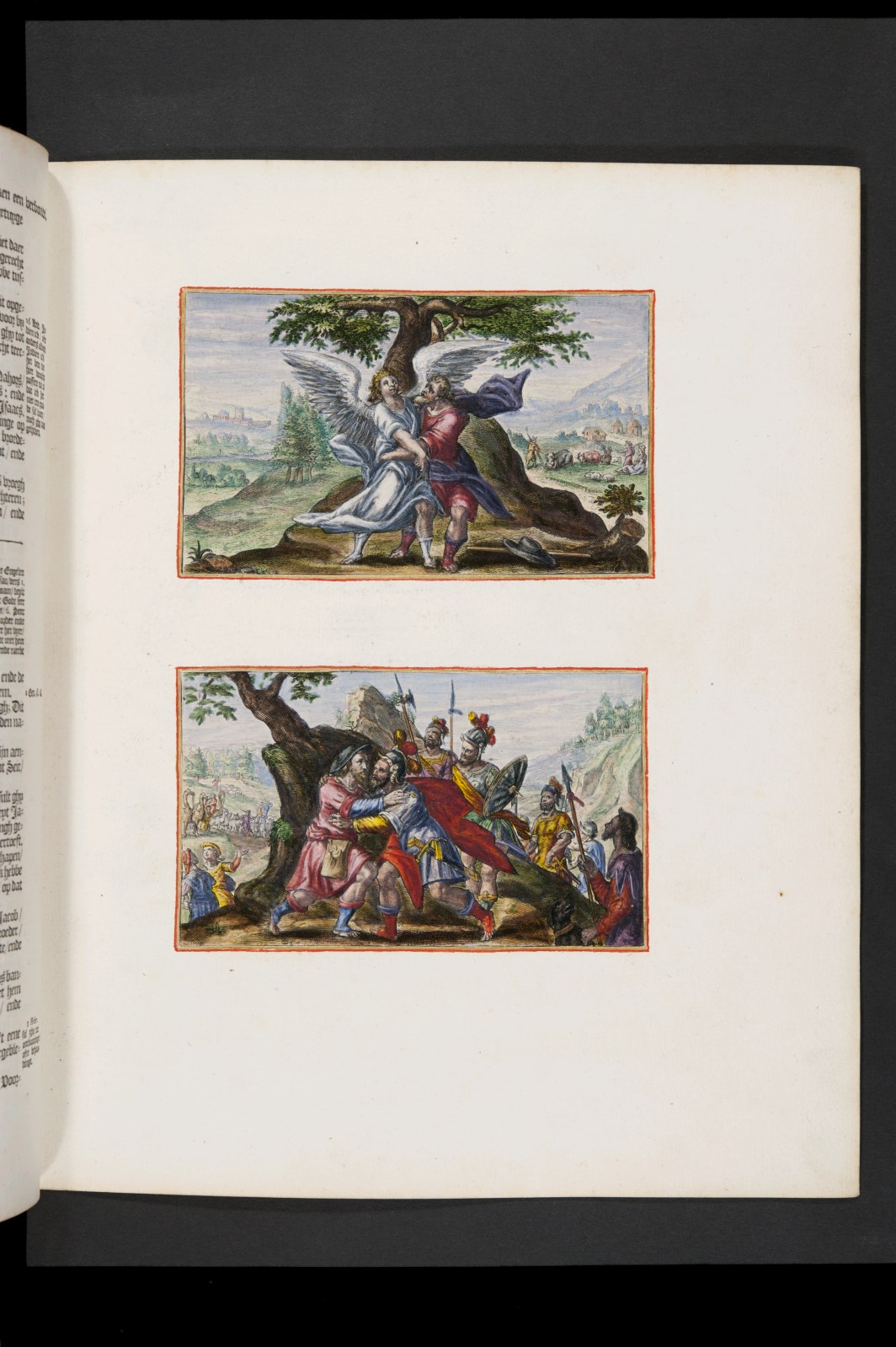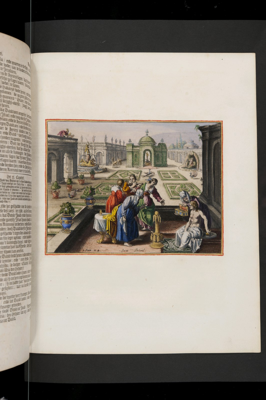 Het boek heeft 150 ingekleurde gravures van Hendrik Goltzius, Jacob Matham, de Mariaprenten van Nicolaas Visscher en anderen. Alle illustraties zijn handgekleurd en goudgehoogd door Dirk Jansz van Santen en de snede is verguld. De bruine segrijn leren band die later zwart is geverfd, is versierd met een dubbel blind lijnkader op het voor- en ...