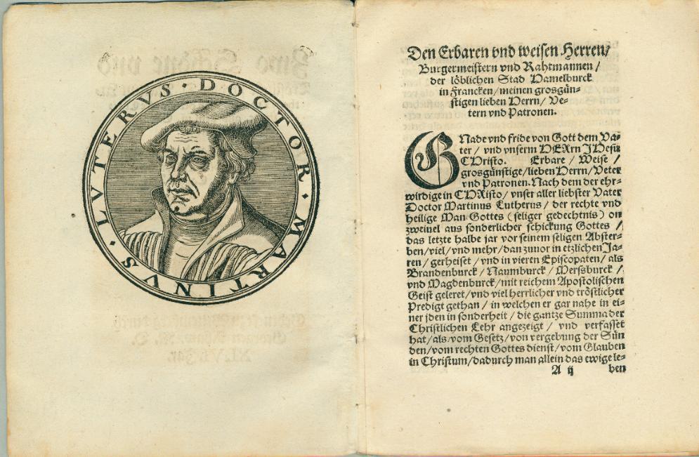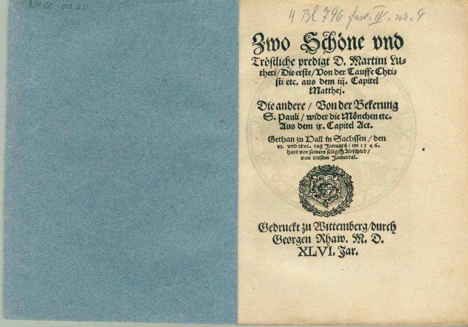 Zwo Schöne vnd Tröstliche predigt D. Martini Lutheri, Die erste, Von der Tauffe Christi etc. aus dem 3. Cap. Matthej. Die andere, Von der Bekerung S. Pauli, wider die Mönchen etc. Aus dem IX. Capitel : Gethan zu Hall in Sachssen