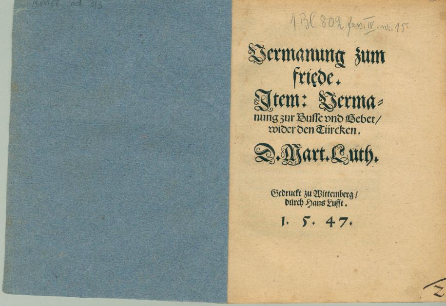 Vermanung zum friede. Item: Vermanung zur Busse vnd Gebet, wider den Türcken