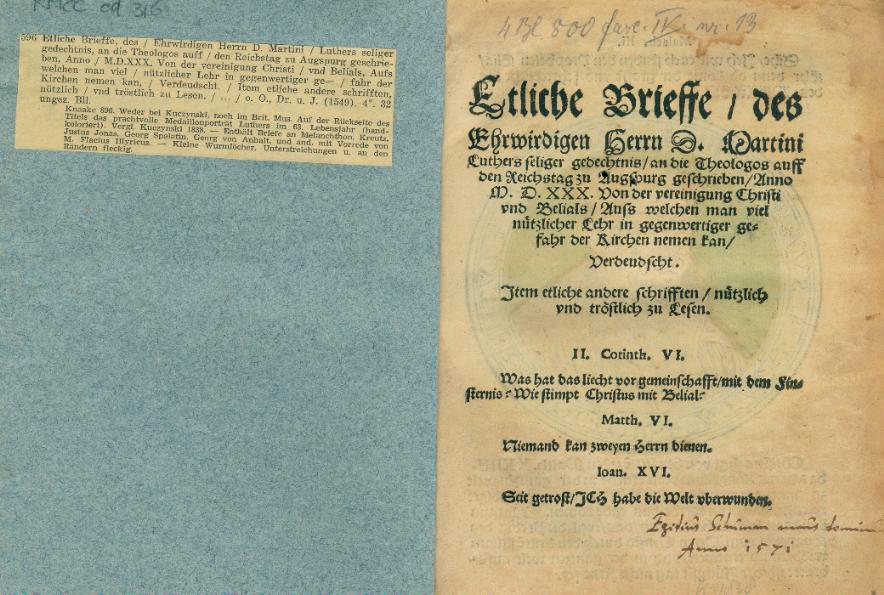 Etliche Brieffe, des Ehrwirdigen Herrn D. Martini Luthers seliger gedechtnis, an die Theologos auff den Reichstag zu Augspurg geschrieben, Anno M.D.XXX. Von der vereinigung Christi vnd Belials, Aufs welchen man viel nützlicher Lehr in gegenwertiger gefahr der Kirchen nemen kan, Verdeudscht. Item etliche andere schrifften, nützlich vnd tröstlich zu Lesen.