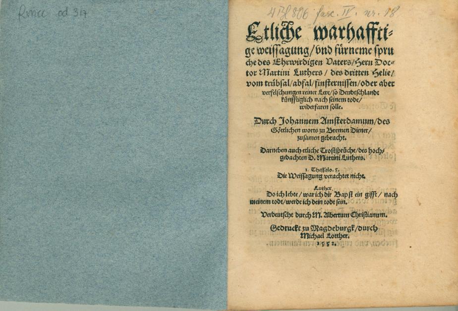 Etliche warhafftige weissagung, vnd fürneme spruche des Ehrwirdigen Vaters, Hern Doctor Martini Luthers, des dritten Helie, vom trübsal, abfal, finsternissen, oder aber verfelschungen reiner Lere, so Deudtschlandt künfftiglich nach seinem tode, widerfaren solle