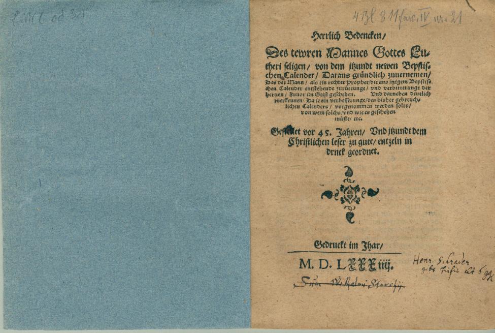 Herrlich Bedencken, Des tewren Mannes Gottes Lutheri seligen, von dem jtzundt newen Bepstischen Calender, Daraus gründlich zuuernemen, Das der Mann, als ein rechter Prophet, die aus jtzigem Bepstischen Calender entstehende zuru¨ttunge, vnd verbitterunge der hertzen, Zuuor im Geist geschehen. Vnd darneben deutlich zuerkennen, Da je ein verbesserunge, des bisher gebreuchlcihen Calenders, vorgenommen werden solte, von ...