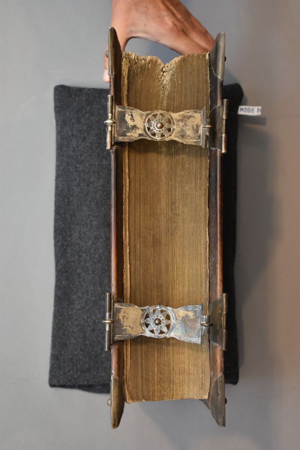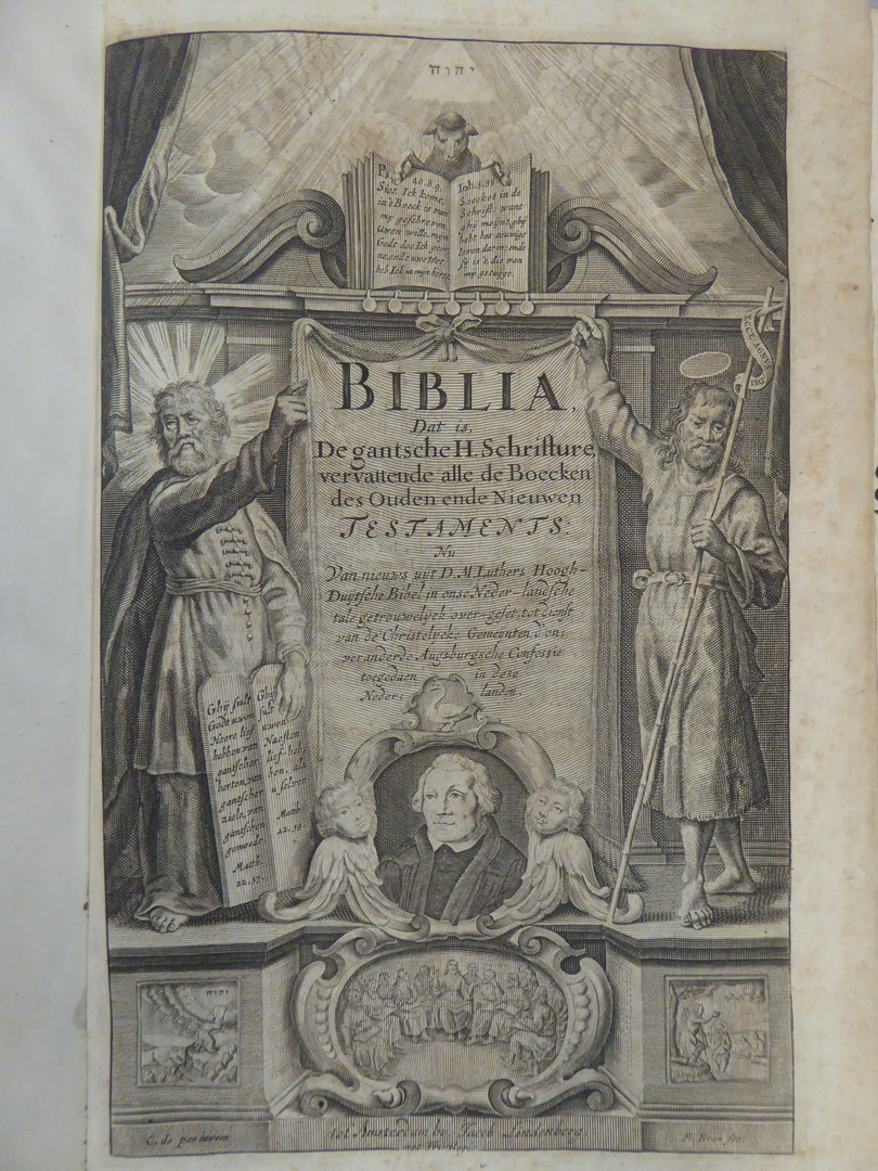 Biblia, dat is, de gantsche H. Schriftuure vervattende alle de boeken des Ouden ende Nieuwen Testaments; nu van nieuws uyt M. Luthers Hoogduitse bybel in onze Nederlandsche taale getrouwelyk overgeset, tot dienst van de christelyke gemeynten, d'onveranderde Augsburgsche Confessie toegedaan in deeze Nederlanden. Op de titel pagina: Centraal, tegen een classicistische achtergrond, een opgehangen draperie ...