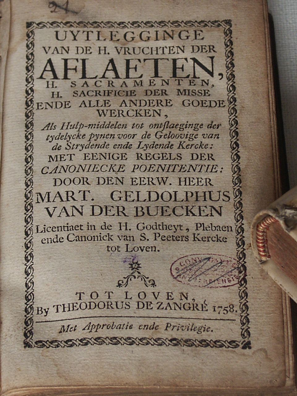 Uytlegginge van de h. vruchten der aflaeten, h. sacramenten, h. sacrificie der misse ende alle andere goede wercken, ende alle andere goede wercken, als hulp-middelen tot ontslaeginge der tydelycke pynen voor de geloovige van de strydende ende lydende kercke: Met eenige regels der canoniecke poenitentie: door den eerw. heer Mart. Geldophus van der Buecken, licentiaet ...