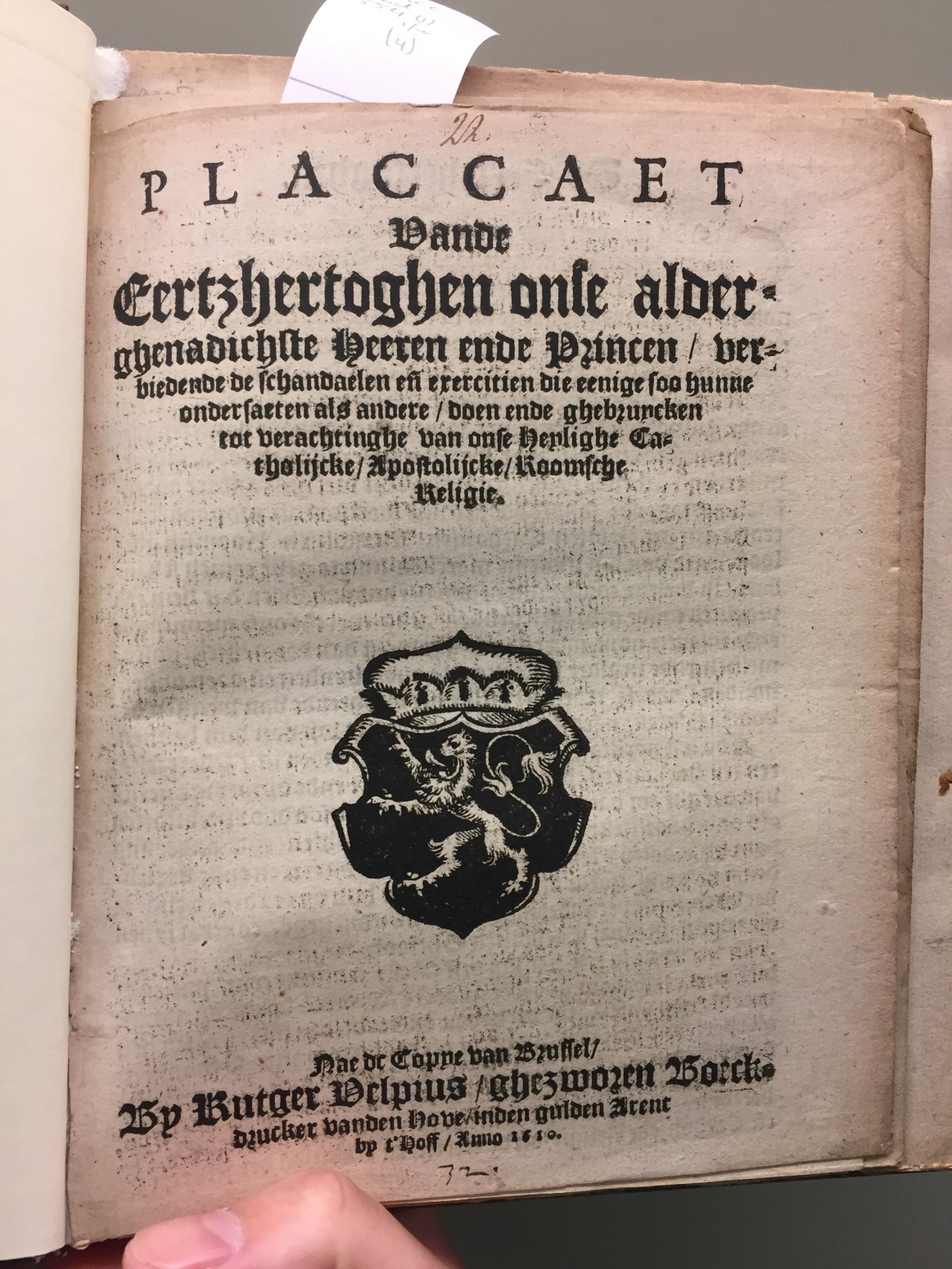 Placcaet vande eertzhertoghen onse alderghenadichste heeren ende princen, verbiedende de schandalen ende exercitien die eenige soo hunne ondersaten als andere, doen ende ghebruycken tot verachtinge van onse heylige Catholicke Apostolijcke Roomsche religie.