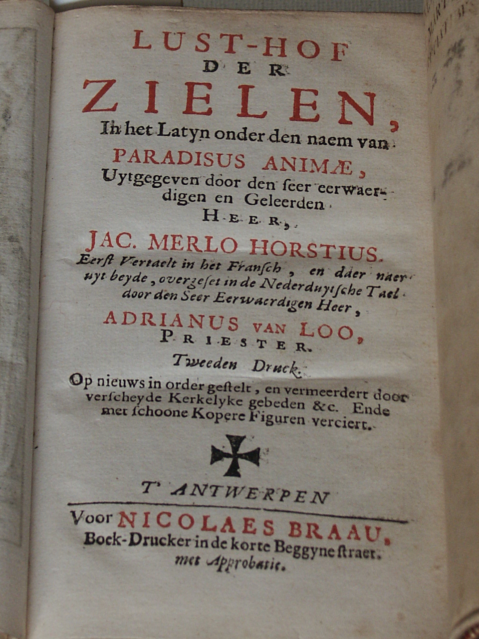 Lust-hof der zielen, in het Latijn onder den naem van Paradisus Animae, uytgegeven door den seer eerwaerdigen en geleerden heer, Jac. Merlo Horstius. Eerst vertaalt [...] Adrianus van Loo [...] Ende met schoone kopere figuren verciert.