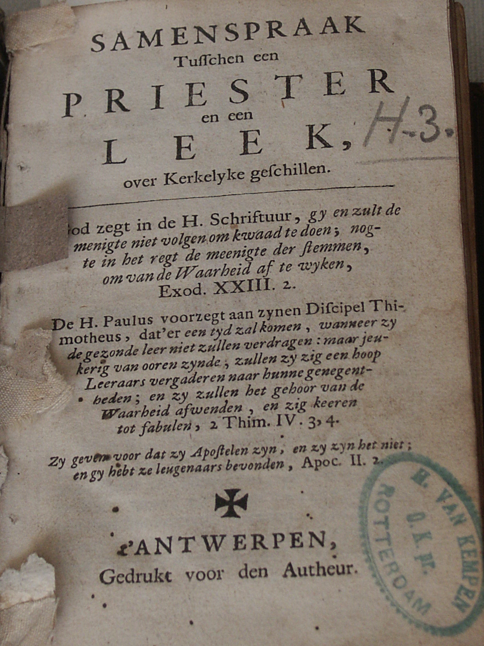 Samenspraak tusschen een priester en een leek over kerkelyke geschillen.