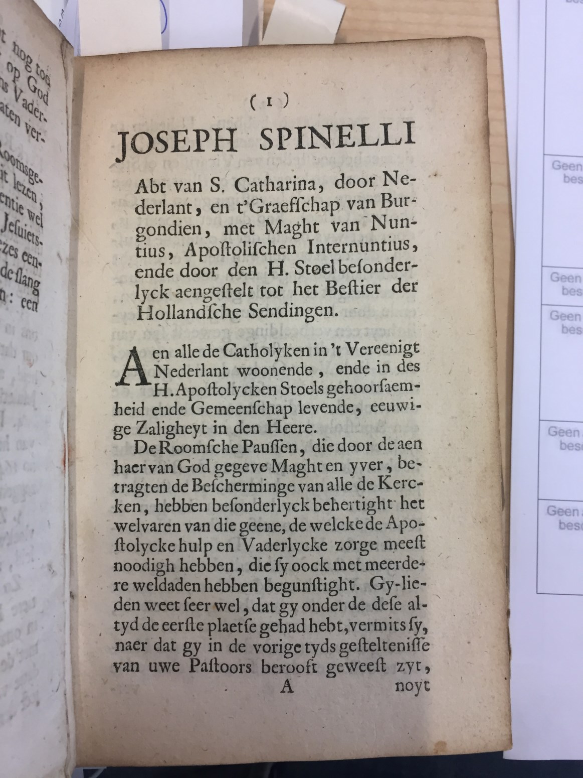(I) Joseph Spinelli. Abt van s. Catharina, door Nederlandt [...] tot het bestier der Hollandsche sendingen.
