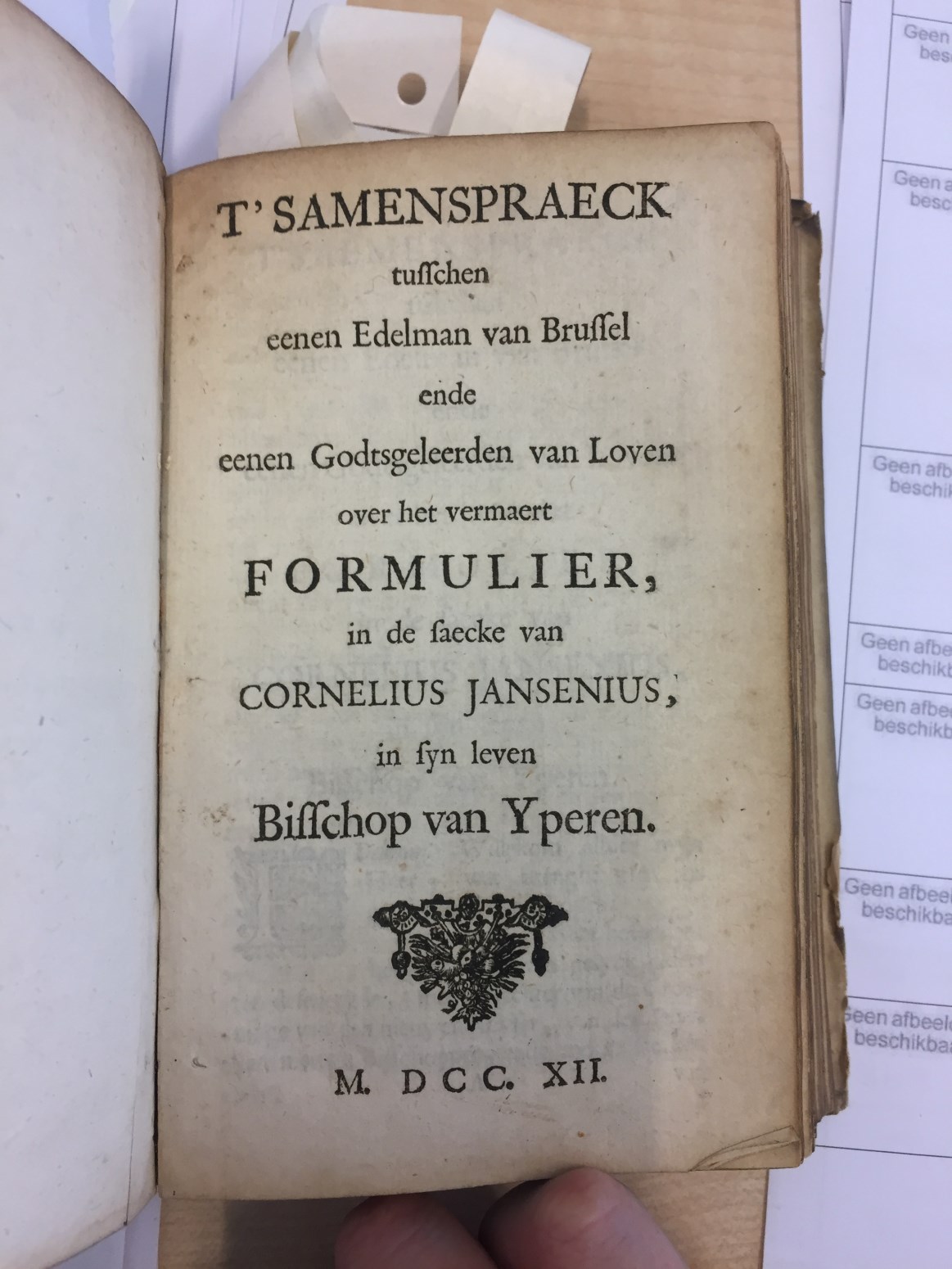 T' Samenspraeck tusschen eenen edelman van Brussel ende eenen godtsgeleerden van Loven over het vermaert Formulier, in de saecke van Cornelius Jansenius, in syn leven bisschop van Yperen. Harderlyke onderwyzinge van den doorluchtigsten heere, den bisscop van Senez [...] en zijn volk in bewaringe geeft zyne laetste gevoelens over de verschillen die de kerk ontrusten.