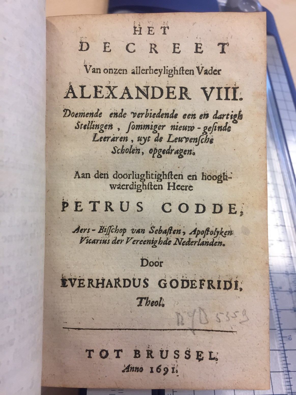 Het decreet van onzen allerheyligsten vader Alexander VIII. Doemende ende verbiedende een en dartigh stellingen, sommiger nieuw-gesinde leeraren, uyt de Leuvensche scholen, opgedragen [...] heere Petrus Codde [...] door Evarhardus Godefridi, theol.