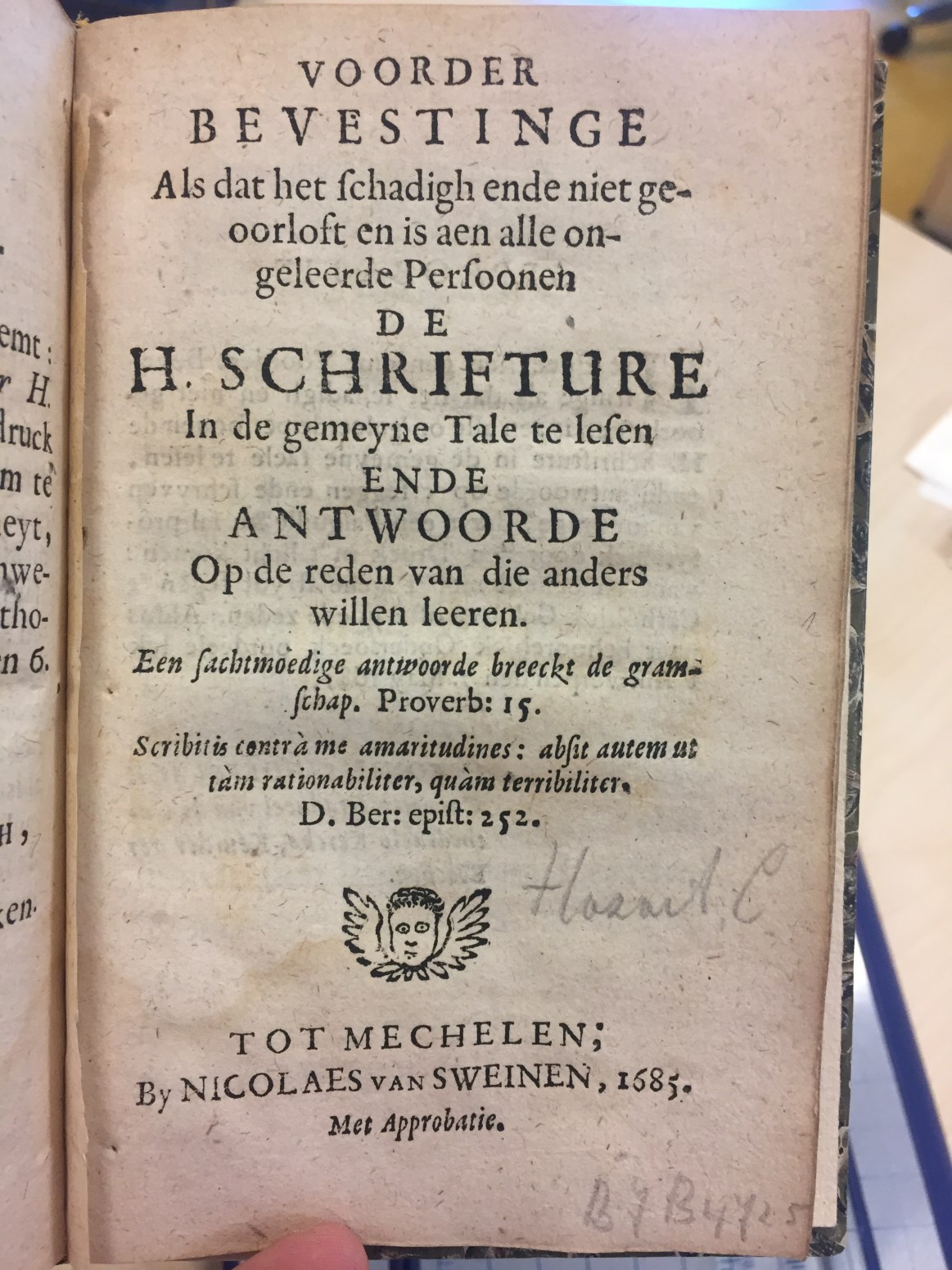Voorder bevestinge als dat het schadigh ende niet geoorloft en is aen alle ongeleerde persoonen de h. schrifture in de gemeyne tale te lesen. Ende antwoorde op de reden van die anders willen leeren.