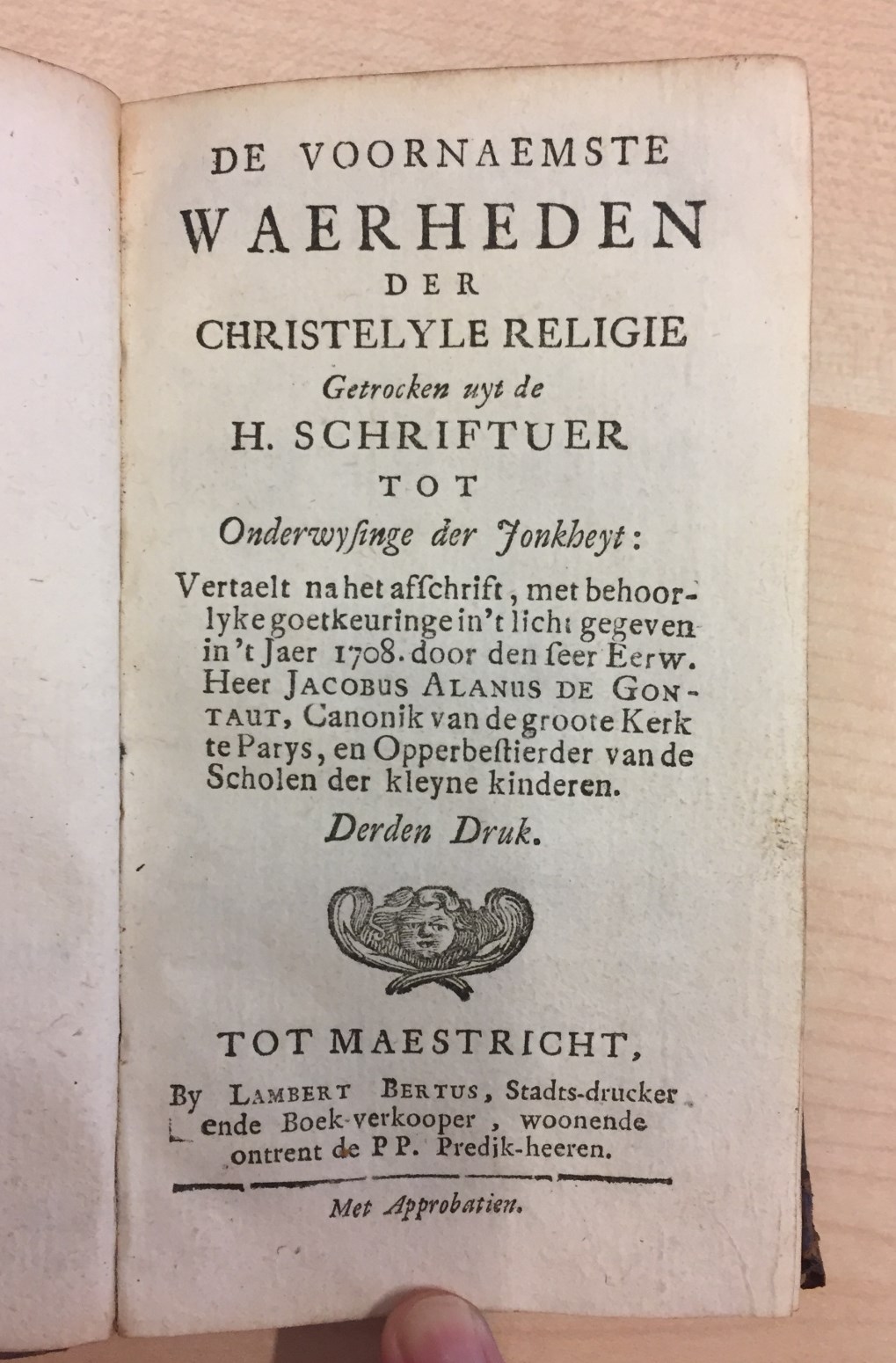 De voornaemste waerheden der Christelyle religie getrocken uyt de h. schriftuer tot onderwysinge der jonckheyt: vertaelt na het afschrift, met behoorlyke goetkeuringe in 't licht gegeven in 't jaer 1708. Door den seer eerw. heer Jacobus Alanus de Gontaut, cononik van de groote kerke Parys, en opperbestierder van de scholen der kleyne kinderen.