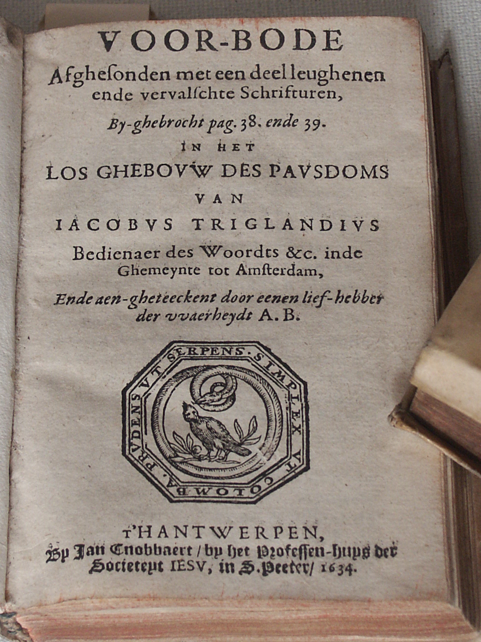 Voor-bode afghesonden met een deel leughenen ende vervalschte schrifturen, by-ghebrocht pag. 38. ende 39. in het los ghebouw des pausdoms van Jacobus Triglandius [...] ende aen-gheteeckent door eenen lief-hebber der waerheydt A.B.